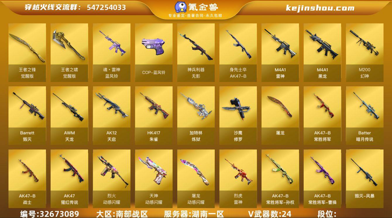 南部战区(湖南一区)ys【爆破号】24v【M200-幻神+皮/周瑜,动感闪耀套装,HK417-朱雀,M4A1-雷神,Barrett-毁灭,QBZ03-吕布,Colt1911-大黄蜂,Colt1911-小故障,胡萝卜匕首】2王者【王者之锋,王者之啸】1炫金【炫金骑士】6角色【四防王者涂鸦,炫,乔伊教练,奇洋探员,修道士,云海玲珑】1音效【Barrett-毁灭音效卡】8皮【幻神-周瑜,雷神-烈虎,毁灭-风暴,火麒麟-CF STAR】VIP6截图展示段位不代表实际段位 如赛季更新等不可抗拒因素发生变化、时限道具不保证所剩时间