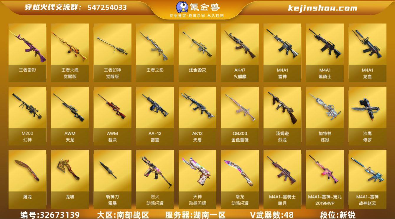 湖南一区-49V-5王者-1炫金 【热门武器】:QBZ03-金色蔷薇,M200-幻神,M4A1-黑骑士*2,汤姆逊-烈龙*7,加特林-炼狱,斯泰尔-蝴蝶,USP-雷暴,沙鹰-修罗*4 【王者炫金武器】:王者之影,王者雷影,炫金毁灭,王者之魄高爆手雷 【音效卡】:M4A1-雷神音效卡 【皮肤】:M200-幻神-黄忠皮肤,雷神-荣耀之魄,雷神-耀金皮肤,M4A1-战神赵云,雷神-宠儿-2019MVP,雷神-源计划2.0专属 皮肤,火麒麟-平天大圣,黑骑士-暗月,AWM-天龙-传奇白鲨,修罗-星空 【角色】:迷迭香,王者春,乔伊教练,暗夜-X,初恋灵狐,风暴女,嘉年华灵狐,兰-海滩派对,零-水下丽影,潘多拉-甜心教官,铁骑荣耀,职业选手 【人偶武器】:斯泰尔-蝴蝶,Scar Light-马枪,AWM-灵狐-15周年嘉年华 【挑战大师】:神圣爆裂者III 【英雄级武器】:AK47-火麒麟,M4A1-雷神*2,M4A1-黑骑士*2,AK12-天启,M4A1-龙血*2,QBZ03-金色蔷薇,烈火-动感闪耀,王者火魄-觉醒版,AWM-天龙,AWM-裁决,M200-幻神,王者幻神-觉醒版,加特林-炼狱,汤姆逊-烈龙*7,AA-12-雷霆,沙鹰-修罗*4,USP-雷暴,天神-动感闪耀,屠龙,龙啸*2,屠龙-动感闪耀,斩神刀-雷暴,高爆手雷-雷暴*4,手雷-动感闪耀,闪光弹-雷暴*4,烟雾弹-雷暴...