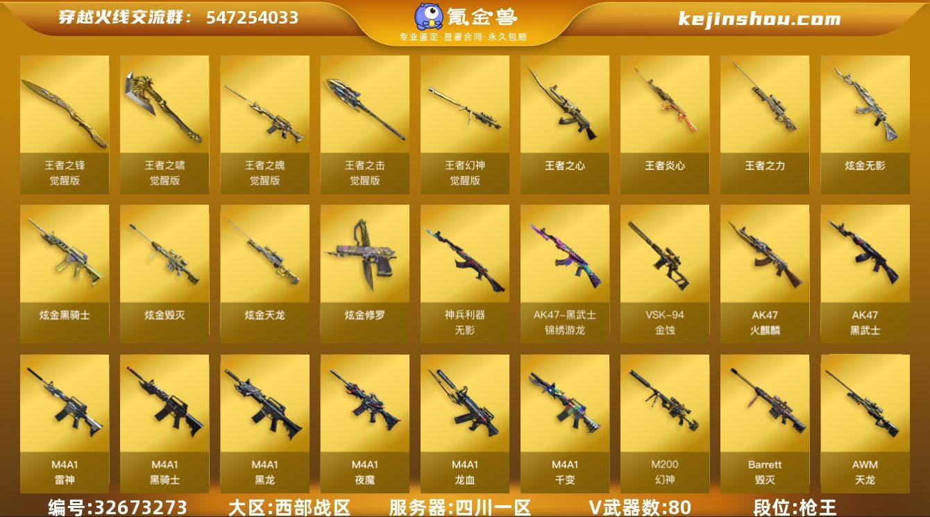 四川一区-93V-10王者武器数-9炫金武器数 【热门武器】:QBZ03-金色蔷薇,HK417-朱雀,M200-幻神,死亡之眼,王者炎心,炼狱-迷你小钢,毒蜂,M4A1-黑骑士,汤姆逊-烈龙*6,加特林-炼狱,斯泰尔-蝴蝶,沙鹰-修罗*4,炽芒蝶刃,金刚伞 【王者炫金武器】:王者炎心,王者之心,王者之力,炫金骑士*3,炫金无影,炫金毁灭,炫金天龙*3,炫金修罗 【音效卡】:屠龙-动感闪耀 音效卡,天神-动感闪耀 音效卡,烈火-动感闪耀 音效卡,M4A1-雷神音效卡,M4A1-黑骑士音效卡,Barrett-毁灭音效卡 【皮肤】:AWM-裁决-百城联赛天津皮肤,雷神-荣耀之魄,雷神-宠儿-2019MVP,雷神-宇航兔皮肤,火麒麟-华夏之心,火麒麟-平天大圣,毁灭-暗月,毁灭耀金皮肤,毁灭-英雄计划 皮肤,黑龙-能量核心,黑骑士-电玩青兔皮肤,修罗-能量核心,修罗-冠军之魂*2,屠龙-春桃 皮肤,龙啸-青青莓果 皮肤 【角色】:炫,鹰,王者-瞳-闭月羞花,王者玲珑,奇洋探员,乔伊教练,幻面灵狐,嘉年华灵狐,娟娟,兰-空鹰,潘多拉-甜心教官,青霞仙子,蜀雪,铁骑荣耀,兔囡囡,团团 【人偶武器】:炼狱-迷你小钢,迷你宝贝,斯泰尔-蝴蝶,Barrett-夜玫瑰 【暴走生化】:毒蜂,死亡之眼 【挑战大师】:AK47-冰龙粉...