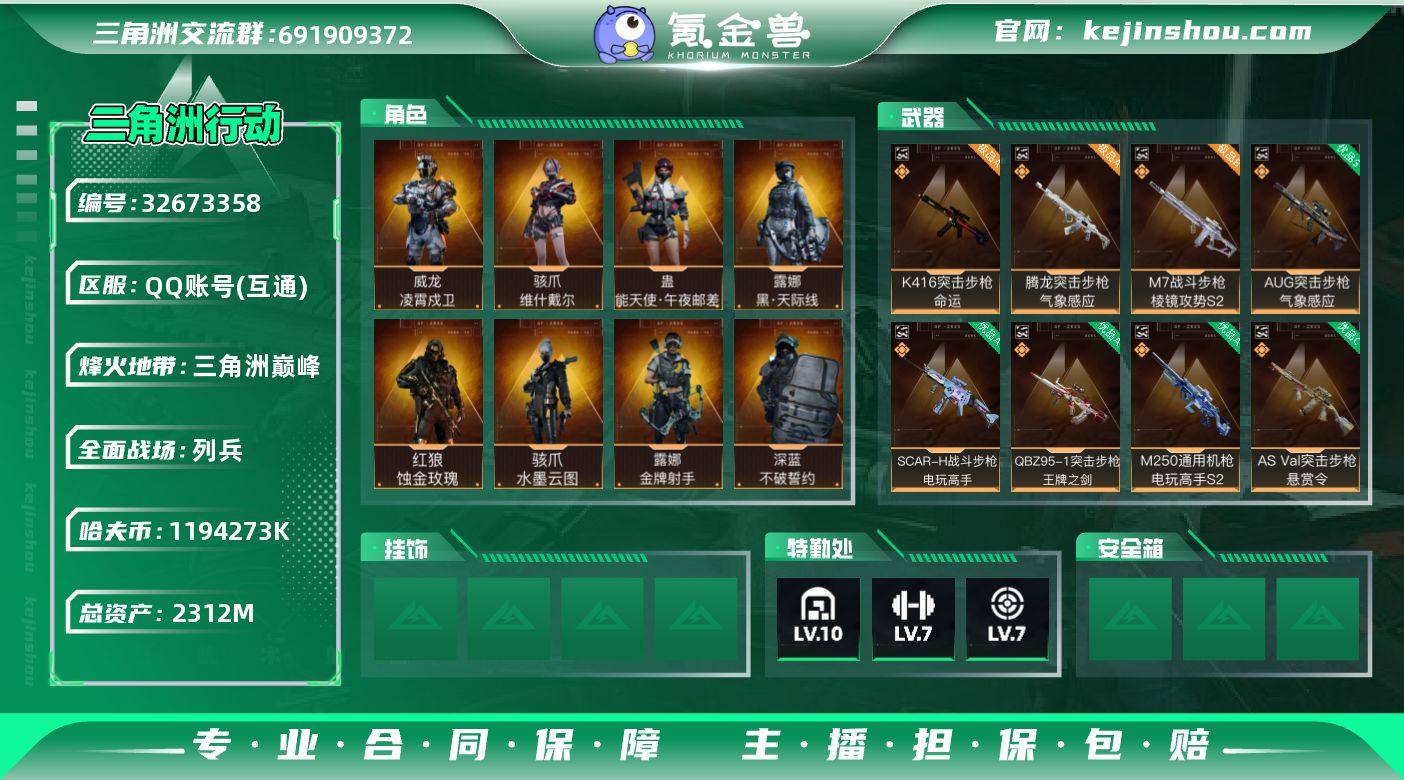 A11509/可二次/QQ区/【极品B黄钻M7+8w点券+2.3B资产】/【总资产:2.3B+M7黄钻棱镜攻势(极品B)+M7棱镜攻势S2(优品S)+腾龙气象感应(电极品A)+近战暗星+近战怜悯+近战北极星+近战赤枭+近战龙牙+近战信条+4级处刑者+全红皮+部门全4+满特勤+非洲之心+海洋之泪+S8赛季3x3+695AW子弹】/烽火等级:60级/全面战场:50级/纯币:1194273K/三角券加币:87954(三角币156+三角券87798)【近战-暗星/近战-怜悯/近战-北极星/近战-赤枭/近战-龙牙/近战-信条/4级处刑者】【红狼-蚀金玫瑰/骇爪-水墨云图/威龙凌霄戍卫/蛊-午夜邮差/露娜-黑天际线/骇爪维什戴尔】【红狼-电锯惊魂/蜂医无题密令/露娜-金牌射手/深蓝-不破誓约/无名-夜鹰】/部门:44444/特勤等级(技术中心3级/工作台3级/制药台3级/防具台3级/仓库10级/指挥中心6级/训练中心7级/靶场7级/潜水中心3级/收藏室2级)AUG气象感应(毒优品S)/王牌之剑(优品A)/命运(极品A)/SCAR电玩高手(优品A)/巨浪(优品C)/电玩高手S2(优品A)橙色挂饰x21/段位:三角洲巅峰(流动资产:1.8B)/详细看图