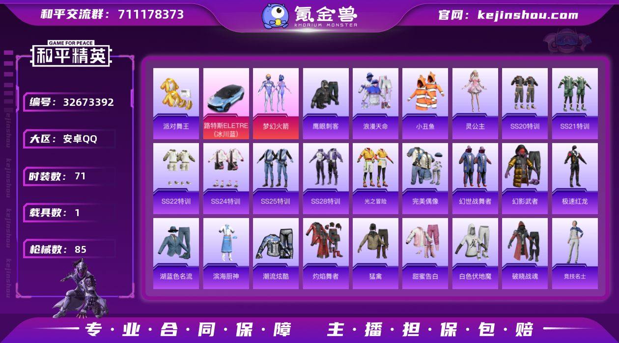 【特价出售/店主推荐】安卓 手Q-1粉装-3特效枪-1载具-0粉色飞行器-24718热力值-2王牌印记-71套装-85枪皮 【热门品类】:粉装-梦幻火箭,套装-浪漫天命,套装-派对舞王,套装-小丑鱼 【粉色套装】:粉装-梦幻火箭 【粉色枪皮等级】:ACE32-萌骑漫游(三级),AKS-74U-森灵之息(五级),Mk14-福马献瑞(五级) 【粉色载具】:路特斯ELETRE(冰川蓝) 【粉色枪皮】:ACE32-萌骑漫游,AKS-74U-森灵之息,Mk14-福马献瑞