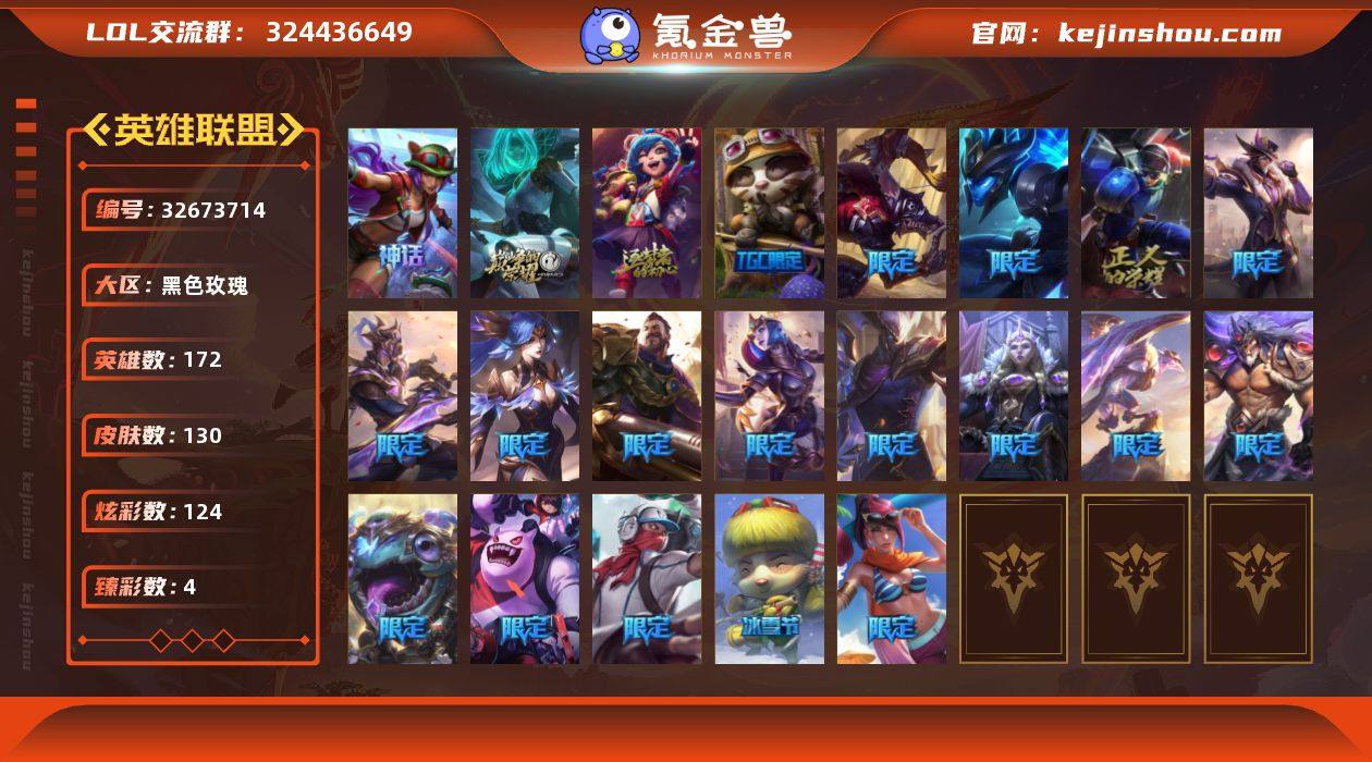 未定级段位-172英雄-130皮肤-124炫彩-0终极-3神话-20限定-7传说-28史诗 【神话皮肤】:十周年纪念安妮,源代码乐芙兰,十五周年纪念希维尔 【臻彩皮肤】:冠军之矛卡莉丝塔凯旋圣装,幻灵战斗猫金克丝梦幻强袭,魔女阿卡丽虚荣,红莲之刃锐雯 【冰雪限定】:圣诞开心鬼提莫 【限定皮肤】:冠军之矛卡莉丝塔,暗杀星努努和威朗普,SSW辛吉德,胜利枪神格雷福斯,胜利女神奥莉安娜,胜利之剑亚托克斯,胜利女神瑟庄妮,胜利凤凰艾尼维亚,胜利之王泰达米尔,胜利巨口克格莫,胜利女神娑娜,胜利剑圣易,胜利之运崔斯特,胜利女神菲奥娜,泳池派对菲奥娜,密林猎手提莫,都铎王朝图奇,防暴天使凯尔 【传说皮肤】:大天使长米迦勒凯尔,驯龙炮手崔丝塔娜,双重冰晶艾尼维亚,黯黑魔龙希瓦娜,符文战熊沃利贝尔,女校长菲奥娜,灌篮高手德莱厄斯 【史诗皮肤】:冰霜烈焰安妮,狼外婆沃里克,战争血统蒙多,夜行义贼艾瑞莉娅,恐惧新星普朗克,血石诅咒塔里克,抵抗军天使凯特琳,暗星嘉文四世,死亡绽放伊莉丝,腥红之月伊莉丝,三昧真火孙悟空,斗战胜佛孙悟空,V字仇杀者布兰德,生化博士黑默丁格,四神之力乌迪尔,兔女郎锐雯,深海怪鱼克格莫,侏罗纪化石克格莫,战地机甲克格...