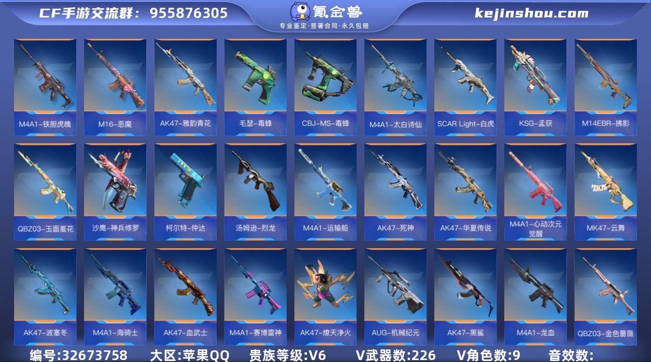 9英雄角色数-217英雄武器数 【王者系列】:王者之影,王者之心,王者之锋,王者之魂 【热门武器】:KSG-孟获,M4A1-游骑兵,81式-阿波罗,AN94-盖 【角色】:审判者,葵,幽灵刀锋-觉醒,瞳,关小雨,职场灵狐-赛事经理,零-水下丽影,春节兰-X,炽天使-X 【英雄武器】:AK47-无影,AK47-火麒麟,AK47-燎天净火,AK47-血武士*2,AK47-波塞冬,AK47-华夏传说,AK47-死神,AK47-黑鲨,AK47-木兰*2,AK47-雅韵青花,AK47-谜城烟火,M4A1-雷神,M4A1-黑骑士*2,M4A1-死神,M4A1-游骑兵,M4A1-龙血,M4A1-赛博雷神,M4A1-海骑士*2,M4A1-堕天神,M4A1-心动次元觉醒,M4A1-运输船*2,M4A1-夏清,M4A1-太白诗仙,M4A1-铁胆虎魄*2,SCAR-幽暗骑士,SCAR Light-白虎,SCAR-探星者,AN94-盖,AUG-机械纪元,M14EBR-拂影,M14EBR-葫芦山庄,M16-恶魔,AK12-天启,QBZ03-金色蔷薇*2,QBZ03-玉面羞花,HK417-炎龙铠甲,MK47-云舞*2,G3A3-衍神兵,QBZ97-浩瀚征途,AWM-天龙,AWM-大湾溢彩,巴雷特-毁灭*5,巴雷特-极光*2,M200-心动次元觉醒,98K-黑骑士*3,RPK-盘龙,加特林-堡垒觉醒,刘易斯-血月,汤姆逊-烈龙,双持斯泰尔-天使*4,CBJ-MS-毒蜂,CZS2-心动次元,打击者-天神,地狱火*4,...