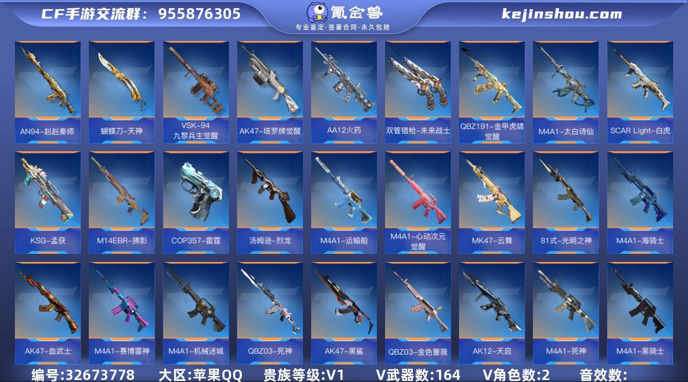 3英雄角色数-161英雄武器数 【王者系列】:M12S-雷霆王者 【热门武器】:KSG-孟获,81式-光明之神,COP 357-雷霆*2,AN94-盖 【角色】:关小雨*2,炽天使-X 【英雄武器】:AK47-火麒麟,AK47-血武士,AK47-黑鲨,AK47-木兰*2,AK47-塔罗牌觉醒,AK47-谜城烟火,M4A1-雷神,M4A1-黑骑士,M4A1-死神,M4A1-机械迷城,M4A1-赛博雷神,M4A1-海骑士,M4A1-心动次元觉醒,M4A1-运输船*2,M4A1-夏清,M4A1-太白诗仙,M4A1-青龙,SCAR Light-白虎,SCAR-探星者,AN94-赳赳秦师,AN94-盖,FAMAS-湮灭,9A91-天神,M14EBR-拂影,M14EBR-葫芦山庄,AK12-天启,QBZ03-金色蔷薇*2,QBZ03-死神,81式-光明之神,MK47-云舞,QBZ191-金甲虎啸觉醒,AWM-天使,AWM-指南针*2,巴雷特-毁灭*5,巴雷特-极光,09式狙-天神*2,98K-黑骑士,98K-星神,VSK-94-九黎兵主觉醒,VSK-94-金蚀,加特林-堡垒*2,加特林-蟒蛇,刘易斯-天使,刘易斯-星际方舟觉醒,QBB95-极光,MK5-极光,汤姆逊-烈龙,CZS2-心动次元,CZS2-血月,地狱火,地狱烈炎,AA12-火药,KSG-孟获,USP-神罚*6,USP-机械迷城*2,USP-太白诗仙,沙鹰-宇航兔兔,蟒蛇-火力竞放觉醒,改装GLOCK-木兰,COP 357-雷霆*2,QSZ92-华夏传说,双管...