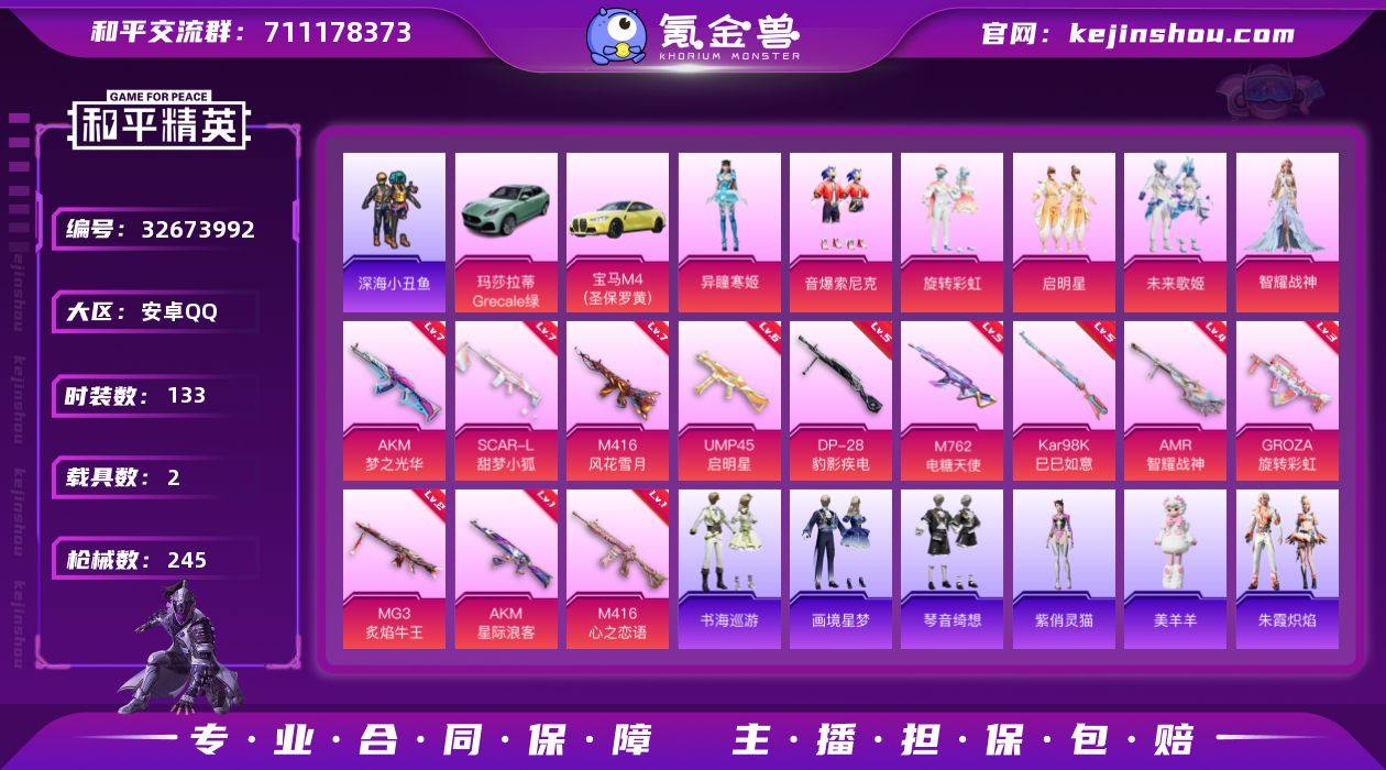 可二次【特价出售/店主推荐】安卓 手Q-6粉装-16特效枪-2载具-1粉色飞行器-75607热力值-1王牌印记-133套装-245枪皮【热门品类】:粉装-音爆索尼克,套装-深海小丑鱼,套装-龟仙【粉色套装】:粉装-旋转彩虹,粉装-启明星,粉装-音爆索尼克,粉装-未来歌姬,角色-智耀战神,角色-异瞳寒姬【粉色枪皮等级】:AKM-梦之光华(七级),AKM-星际浪客(一级),SCAR-L-甜梦小狐(七级),M416-心之恋语(一级),M416-风花雪月(七级),GROZA-旋转彩虹(三级),M762-电糖天使(五级),ACE32-萌骑漫游(一级),UMP45-启明星(六级),AKS-74U-森灵之息(五级),Kar98K-巳巳如意(五级),Mk14-福马献瑞(三级),AMR-智耀战神(四级),DP-28-豹影疾电(五级),MG3-炙焰牛王(二级),PKM-萌骑夺宝(二级)【粉色载具】:玛莎拉蒂Grecale(薄荷绿),宝马M4(圣保罗黄)【粉色枪皮】:AKM-梦之光华,AKM-星际浪客,SCAR-L-甜梦小狐,M416-心之恋语,M416-风花雪月,GROZA-旋转彩虹,M762-电糖天使,ACE32-萌骑漫游,UMP45-启明星,AKS-74U-森灵之息,Kar98K-巳巳如意,Mk14-福马献瑞,AMR-智耀战神,DP-28-豹影疾电,MG3-炙焰牛王,PKM-萌骑夺宝【粉色飞行器】:炫彩糖果飞行器