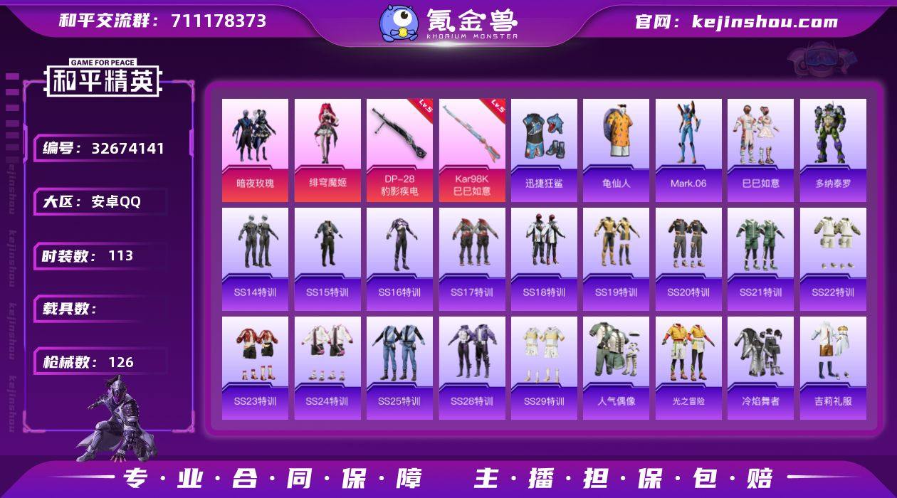 安卓 手Q-2粉装-2特效枪-0载具-0粉色飞行器-36763热力值-9王牌印记-113套装-126枪皮HZ2611811 【热门品类】:套装-龟仙人,角色-Mark.06 【粉色套装】:粉装-暗夜玫瑰,角色-绯穹魔姬 【粉色枪皮等级】:Kar98K-巳巳如意(五级),DP-28-豹影疾电(五级) 【粉色枪皮】:Kar98K-巳巳如意,DP-28-豹影疾电 【粉色降落伞】:暗夜玫瑰降落伞,蓝莓炮弹降落伞,青春物语降落伞,异瞳寒姬降落伞,极意拳锋降落伞 【稀有套装】:套装-龟仙人,套装-巳巳如意,角色-多纳泰罗 【稀有枪皮】:AKM-夜灯,AKM-奇异狩猎者,AKM-彩虹符号,AKM-灼热熔岩,AKM-环太平洋,AKM-生命誓言,AKM-破晓战魂,AKM-萌趣颜团子,AKM-虎虎生威,AKM-霓虹街区,M16A4-夜灯,M16A4-幻世战舞者,M16A4-甜心亚梦,SCAR-L-炫彩节奏,SCAR-L-玉兔迎春,SCAR-L-红色方程式,M416-夜灯,M416-红色方程式,M416-蓝色火焰,GROZA-异彩先驱,GROZA-彩虹符号,AUG-天降萌叽,AUG-耀粉歌者,QBZ-彩虹符号,M762-天降萌叽,M762-瑞龙福将,Mk47-天之羽翼,Mk47-洛神天依,AC-VAL-天降萌叽,AC-VAL-甜心亚梦,蜜獾-天降萌叽,UZI-啾咪啾咪,UZI-天降萌叽,UZI-炫彩节奏,UZI-红色方程式,UMP45-蓝色火焰,Vector-暗夜玫瑰,...