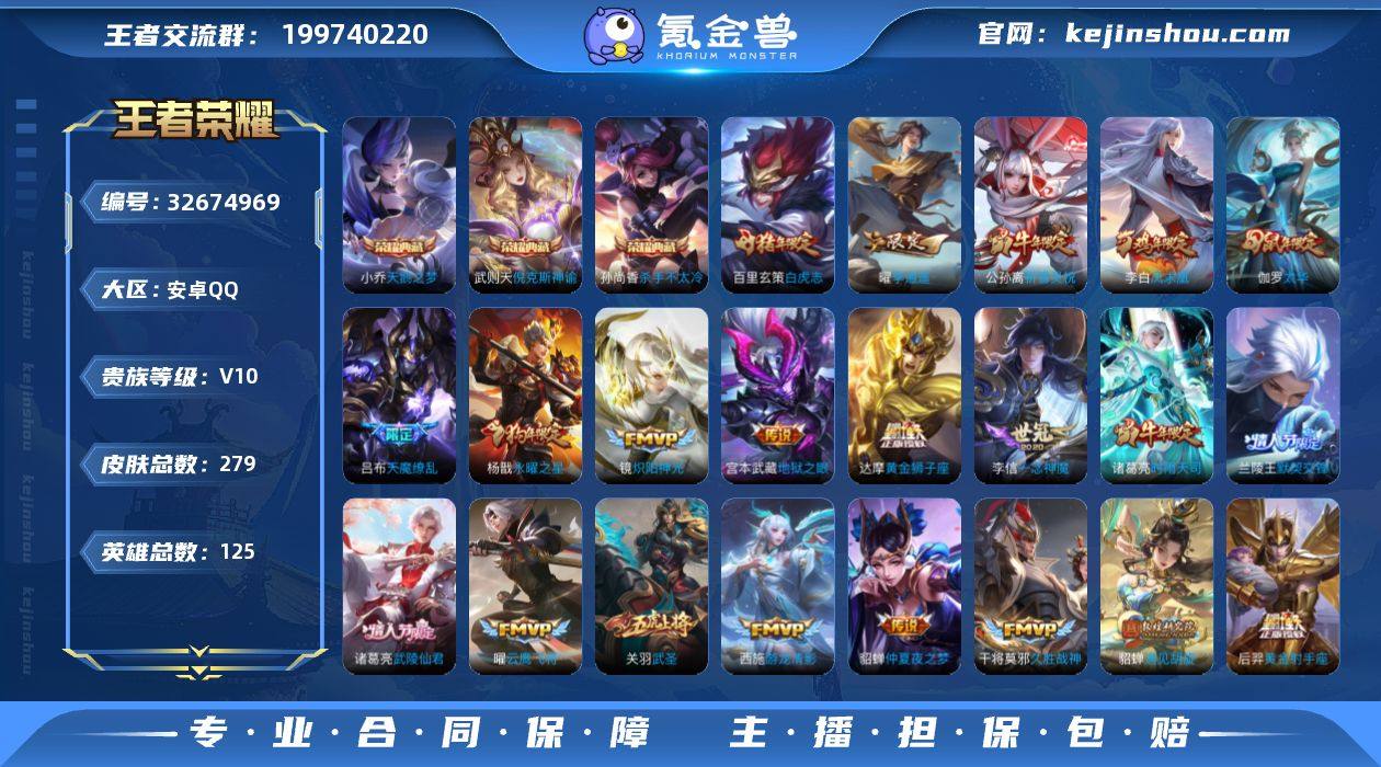实名: 可修改 性别: 男号 贵族等级: V10 英雄数: 125 皮肤数: 279 荣耀水晶: 武则天,天鹅之梦,倪克斯神谕,杀手不太冷 传说皮: 黄金狮子座,黄金射手座,冠军飞将,云鹰飞将,绛天战甲,黄金白羊座,猫影幻舞,久胜战神,炽阳神光,一念神魔,云霓雀翎,地狱火,仲夏夜之梦,音你心动-小乔,零号·赤焰,海洋之心,地狱之眼,飞鸢探春,音你心动-周瑜,胖达荣荣,李逍遥,乞巧织情,时之恋人-刘备,游龙清影,淬星耀世,遇见胡旋,艾琳觅芳踪 限定皮: 冰锋战神,遇见飞天,李小龙,奔雷神使,祈雪灵祝,游园惊梦,梁祝,御风骁将,云端筑梦师,时雨天司,龙胆,白鹤梁神女,武圣,烈魂,辉光之辰,玄嵩,白晶晶,岱宗,天狼溯光者,虎魄,天魔缭乱,神威,蜜橘之夏,永曜之星,幽恒,时之彼端,奇迹圣诞,飞衡,乒乒小将,太华,天狼征服者,冰霜恋舞曲,天狼运算者,逐梦之星,逐梦之影,神奇女侠,天狼绘梦者,凤求凰,白虎志,瑞麟志,玄武志,凤凰于飞,如梦令-嫦娥,至尊宝,默契交锋-兰陵王,一生所爱,武陵仙君,如梦令-后羿,大圣娶亲,默契交锋-花木兰,霸王别姬-项羽,霸王别姬-虞姬,孙行者,猪悟能,五谷丰年 亮点: 【优质装备】:武则天,天鹅之梦(小乔典藏),倪克斯神谕(宇宙婆娘),杀手不太冷,黄金狮子座,黄金射手座,冠军飞将,云鹰飞将(小将军),绛天战...