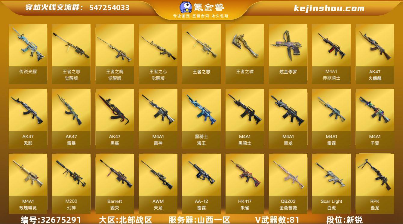 QF-3018-北部传说光耀 qbz金色蔷薇 雷暴套+sup雷暴 cop雷霆 幻神+黄忠皮 白虎 六烈龙+斯泰尔蝴蝶+死亡之眼 七机枪 黑骑士三件套 火麒麟冠军皮三件套 毁灭三件套 雷神宠儿皮三件套带多v武器