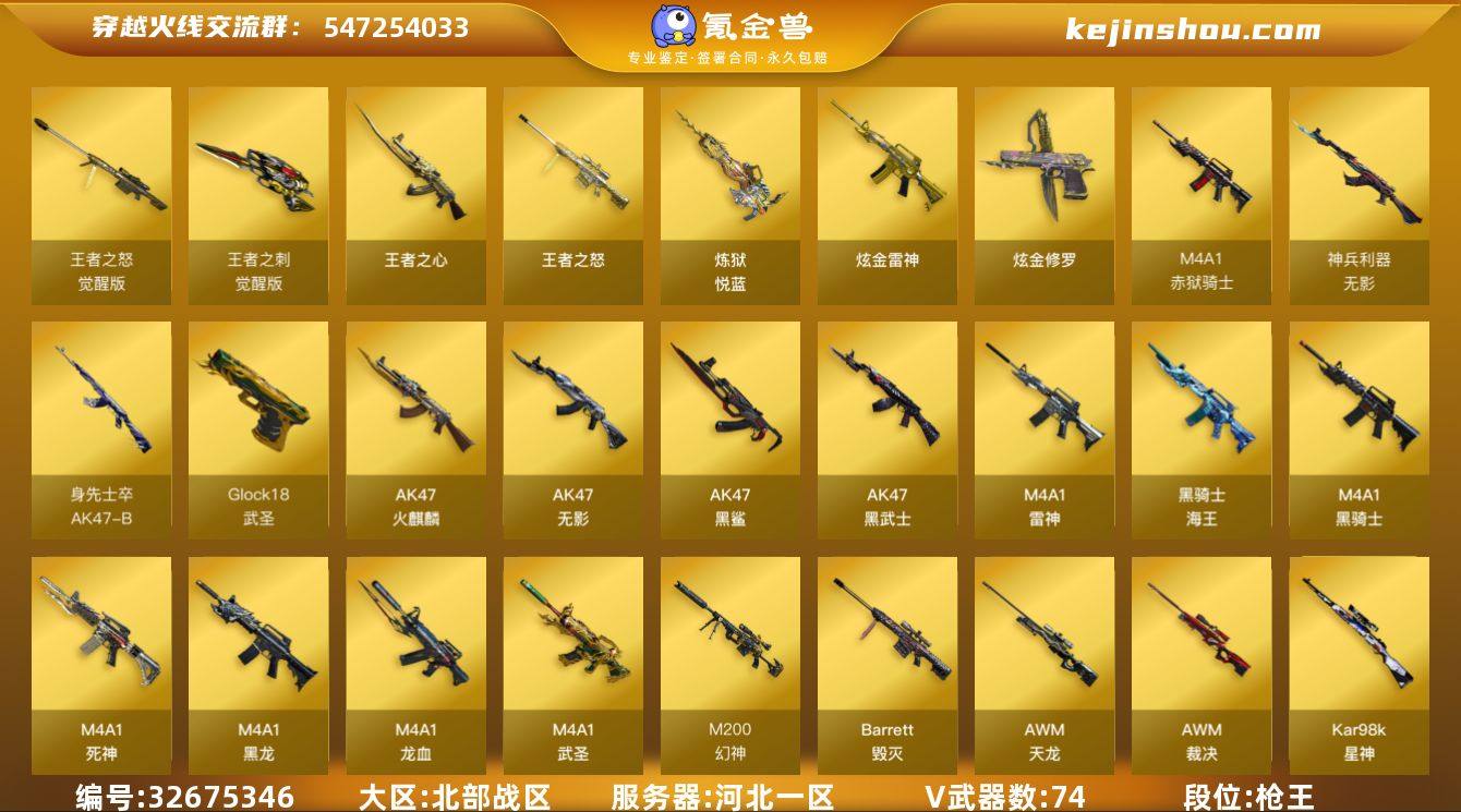 【店主推荐/有二次/秒换绑】河北一区-79V-6王者武器数-2炫金武器数 【热门武器】:QBZ03-金色蔷薇,M200-幻神,M200-竞技荣光,死亡之眼,Kar98K-星神,金色小号,M4A1-黑骑士*3,汤姆逊-烈龙*6,RPK-盘龙,加特林-炼狱,沙鹰-修罗*4 【王者炫金武器】:王者之心,王者之怒,炼狱-悦蓝,炫金雷神,炫金修罗 【音效卡】:M4A1-雷神音效卡,M4A1-黑龙音效卡,M4A1-黑骑士音效卡,Barrett-毁灭音效卡,Barrett-碧霄极光音效卡*2,AWM-昌龙-怀旧音效卡 【皮肤】:烈龙-星空,雷神-星空,雷神-耀金皮肤,火麒麟-平天大圣,毁灭-冠军之怒,黑龙-能量核心,战神-流金岁月皮肤,AK47-B-常胜将军-孙权*3,AWM-天龙-传奇70KG*2,AWM-天龙-传奇白鲨*3,修罗-能量核心,屠龙-荣耀之锋 【角色】:炫,零·纪元,战地猎狐,王者春,王者玲珑-小乔,乔伊教练,修道士,空,暗夜-X,风暴女*2,嘉年华灵狐,娟娟,兰-新年限定,灵狐者-X,灵狐者-黄金海岸,灵狐者-职业经理,潘多拉-X,潜龙队-X,铁骑荣耀,兔囡囡,新灵狐者,新娜塔莎,影武者-X 【人偶武器】:火麒麟-灵狐,AWM-灵狐-15周年嘉年华,海滩汪汪-巴雷特,迷你深渊冰龙,迷你牛魔王,迷你牛牛,闪光弹-小乔,闪光弹-貂蝉,高爆手雷-...