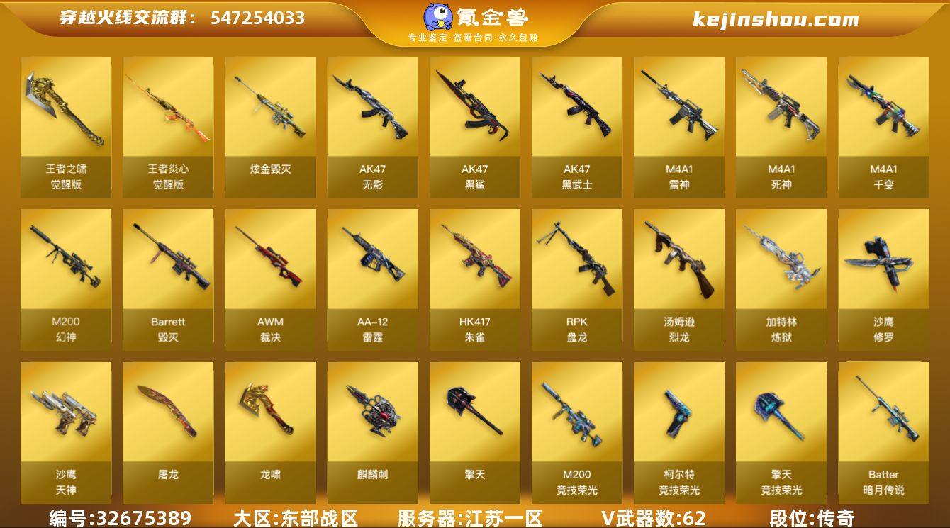 【店主推荐/有二次/秒换绑】幻神单皮!江苏一区-67V-3王者武器数-1炫金武器数 【热门武器】:HK417-朱雀,M200-幻神,M200-竞技荣光,死亡之眼,汤姆逊-烈龙*6,RPK-盘龙*5,加特林-炼狱,沙鹰-修罗*3 【王者炫金武器】:炫金毁灭 【音效卡】:Barrett-毁灭音效卡 【皮肤】:幻神-CFS2022,雷神-虎将,雷神-机甲刑天皮肤,火麒麟-雷神,毁灭耀金皮肤,毁灭-星空,毁灭-黑大圣皮肤,M4A1-千变-孔明皮肤,战神-流金岁月皮肤,修罗-能量核心 【角色】:葵,魅影,修道士,北极狐-X,初恋灵狐,电竞少女,芳心审判者,风暴女*2,虎妞,嘉年华灵狐,灵狐者-X,灵狐者-七夕宝贝,龙儿-小淘气,麻雀,曼陀罗-礼服,潘多拉-X,潘多拉-甜心教官,蜀雪,铁骑荣耀,新娜塔莎,雪莉杨-摸金校尉,樱-战斗天使,影武者-X,雅典娜 【人偶武器】:AWM-灵狐-15周年嘉年华,迷你波特博士,迷你生化手雷,迷你艾比,灵狐娃娃手雷 【暴走生化】:死亡之眼,超级对讲机 【挑战大师】:试炼破坏者III,阐释者III 【英雄级武器】:M4A1-千变,M4A1-雷神,AK47-无影,M4A1-死神,AK47-黑武士,AK47-黑鲨,HK417-朱雀,AK-47-猩红传说,王者炎心-觉醒版,Barrett-毁灭,AWM-裁决*4,M200-幻神,M200-竞...