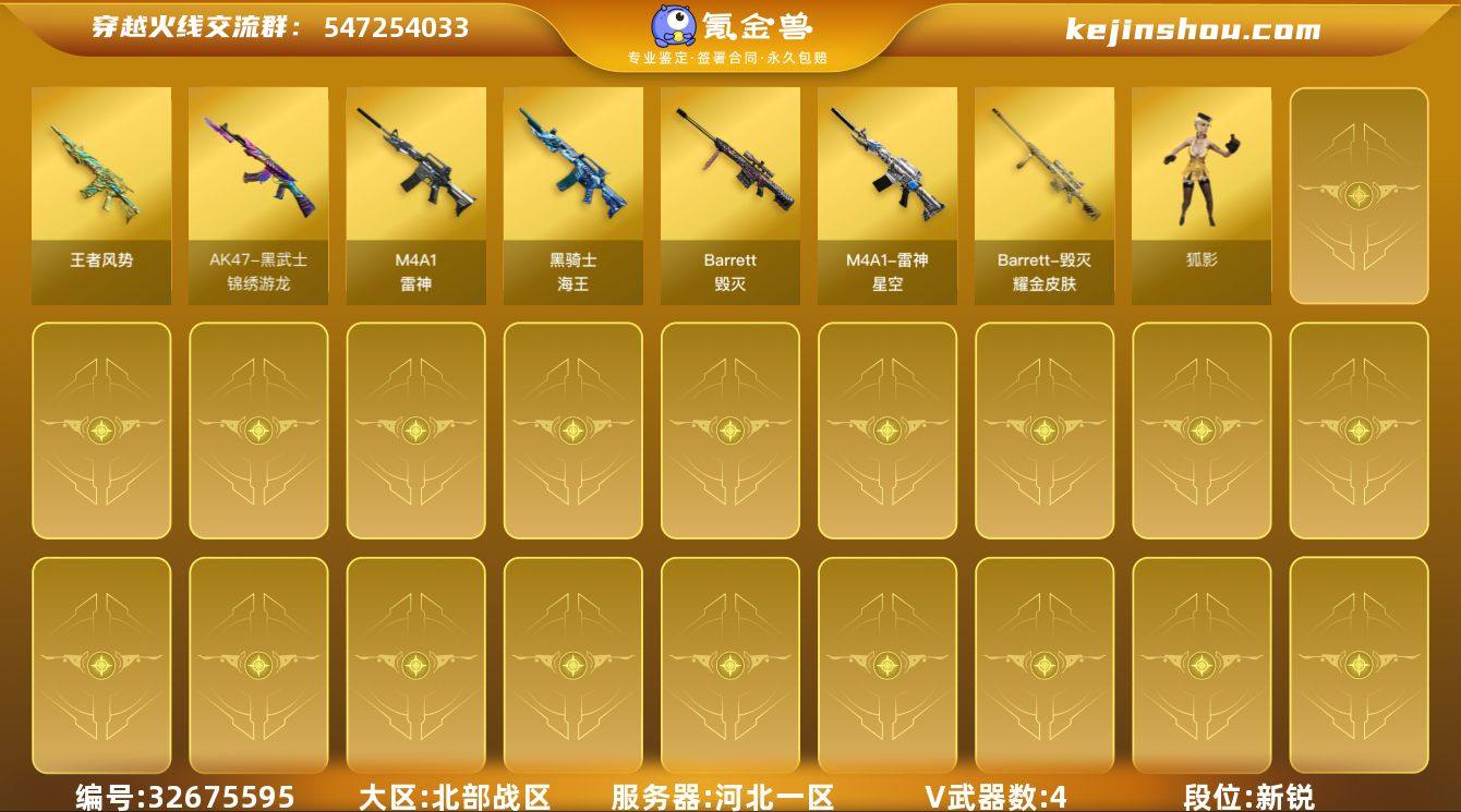 河北一区-5V-1王者武器数-0炫金武器数 【王者炫金武器】:王者风势 【皮肤】:雷神-星空,毁灭耀金皮肤,毁灭-虹光风暴 皮肤,毁灭-英雄计划 皮肤 【角色】:狐影,修道士,空,电竞少女,飞虎队-X,风暴女,娟娟,兰-空鹰,0号玩家,灵狐者-黄金海岸,灵狐者-七夕宝贝,蛇姬 【人偶武器】:黄金迷你深渊冰龙,迷你裂空之翼,迷你波特博士,迷你曼提柯尔,夺魂,迷你火种,迷你生化手雷,迷你超能女侍 【挑战大师】:冰龙粉碎者-白马银枪,机甲撕裂者III,试炼破坏者III,惩戒者III,封神放逐者III*2 【英雄级武器】:M4A1-雷神,黑武士-锦绣游龙,黑骑士-海王,Barrett-毁灭 【源级武器】:源·火麒麟,魂·HK417-朱雀-凤灵,源-金色蔷薇,魂·QBZ03-金色蔷薇-蛇姬,QBZ03-文殊坊,魂·9A91·烈火-电子连击,源-极光,源·天龙,魂·屠龙-惊鸿,魂·擎天-破浪10年,魂·龙啸-玩具枪 【道具】:CFS限定背包,次元之矛-黄金背包*2,次元之矛-背包*2,白狐背包*2,超级背包,金狐背包,黄金曼提柯尔的背包,变异宝贝,生化弹匣,夺命之镰,防化服,金色流光-枪王排位,防弹头盔*2,防弹衣*2,C4工具钳*2,手雷包*2 【特殊枪械】: