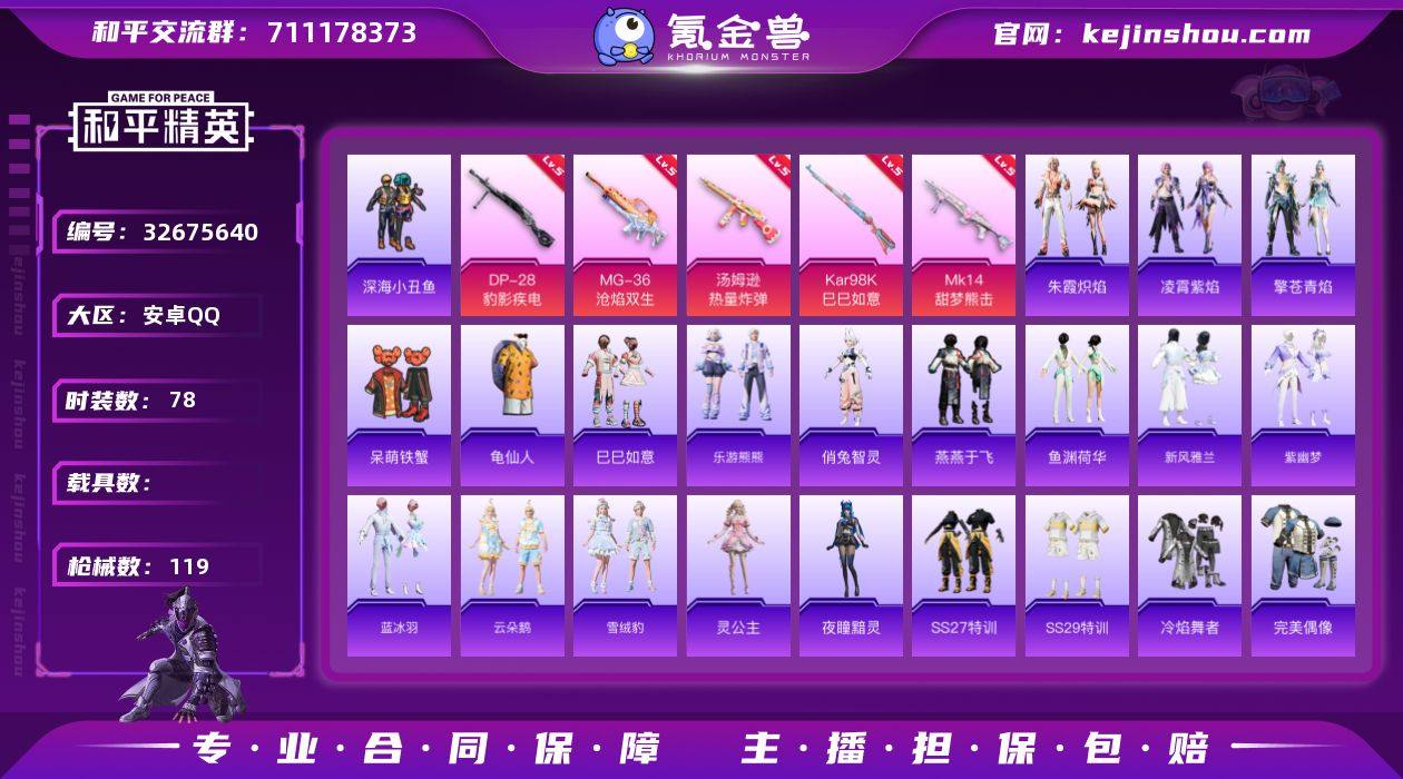 安卓 手Q-1粉装-7特效枪-0载具-0粉色飞行器-28209热力值-2王牌印记-78套装-119枪皮 【热门品类】:套装-深海小丑鱼,套装-龟仙人 【粉色套装】:角色-霁蓝缠春 【粉色枪皮等级】:汤姆逊-热量炸弹(五级),Kar98K-巳巳如意(五级),Mk14-甜梦熊击(五级),Mk14-福马献瑞(一级),AA12-G-萌骑幻想(五级),DP-28-豹影疾电(五级),MG-36-沧焰双生(五级) 【粉色枪皮】:汤姆逊-热量炸弹,Kar98K-巳巳如意,Mk14-甜梦熊击,Mk14-福马献瑞,AA12-G-萌骑幻想,DP-28-豹影疾电,MG-36-沧焰双生 【粉色降落伞】:月影灵韵降落伞 【稀有套装】:套装-龟仙人,套装-巳巳如意,套装-乐游熊熊,套装-马上来财,角色-俏兔智灵,套装-燕燕于飞,套装-鱼渊荷华,套装-新风雅兰,套装-紫幽梦,套装-蓝冰羽,套装-云朵鹅,套装-雪绒豹,角色-灵公主,角色-夜瞳黯灵,套装-朱霞炽焰,套装-凌霄紫焰,套装-擎苍青焰 【稀有枪皮】:AKM-破晓战魂,AKM-龙的传人,M16A4-幻世战舞者,M16A4-红色方程式,SCAR-L-夜灯,SCAR-L-炫彩节奏,M416-红色方程式,M416-蓝色火焰,AUG-耀粉歌者,AUG-月影灵韵,M762-天降萌叽,M762-云朵鹅,AC-VAL-天降萌叽,ARX-凌霄紫焰,UZI-炫彩节奏,UZI-红色方程式,UMP45-夜...