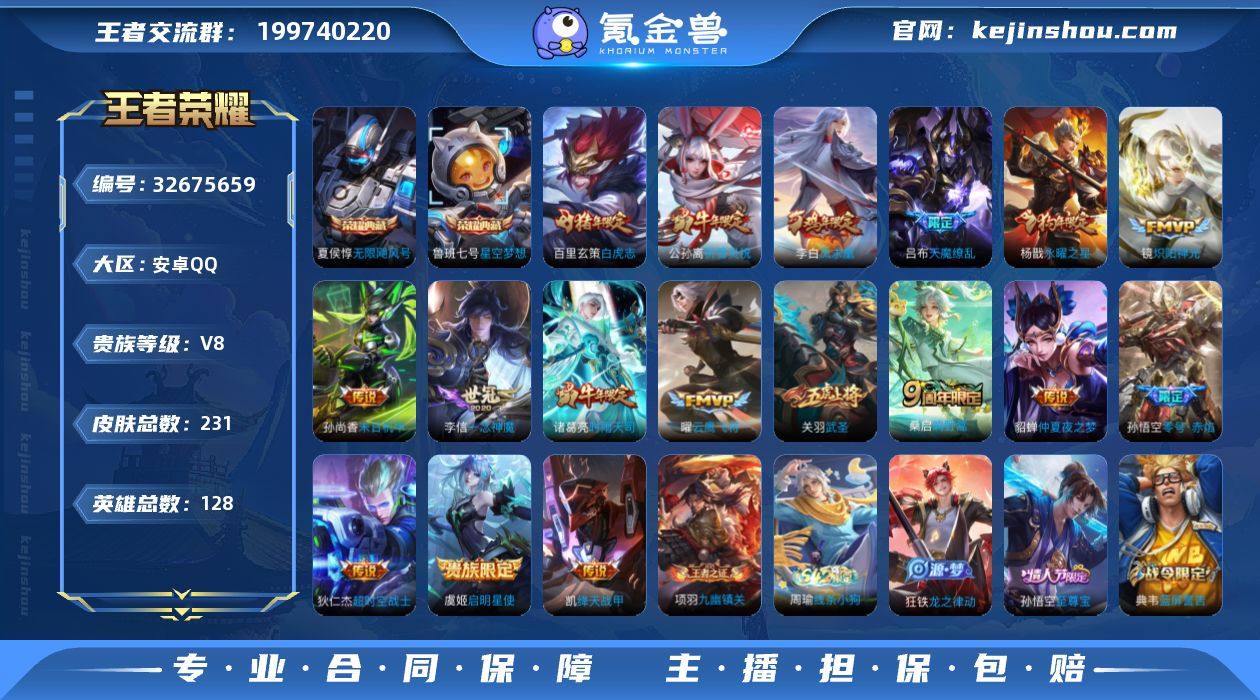 安卓Q-V8-最强王者段位-128英雄-231皮肤-2典藏皮肤-1典藏英雄-17传说-66史诗 【英雄全皮】:孙权全皮 【荣耀典藏】:武则天英雄,夏侯惇无限飓风号,鲁班七号星空梦想 【传说皮肤】:桑启鸣野蒿,公孙离祈雪灵祝,诸葛亮时雨天司,铠绛天战甲,镜炽阳神光,虞姬启明星使,孙悟空零号赤焰,关羽武圣,曜云鹰飞将,李信一念神魔,百里玄策白虎志,杨戬永曜之星,貂蝉仲夏夜之梦,李白凤求凰,孙尚香末日机甲,吕布天魔缭乱,狄仁杰超时空战士 【限定皮肤】:白起狰,狄仁杰阴阳师,虞姬凯尔特女王,赵云皇家上将,嬴政白昼王子,孙尚香蔷薇恋人,鲁班七号狮舞东方,庄周高山流水,高渐离玩趣恶龙,阿轲迷踪丽影,孙膑天狼运算者,芈月重明,吕布天魔缭乱,吕布猎兽之王,吕布御风骁将,周瑜赤莲之焰,元歌云间偶戏,夏侯惇朔风刀,甄姬幽恒,曹操烛龙,典韦穷奇,典韦蓝屏警告,马可波罗逐梦之星,狄仁杰魔术师,狄仁杰万华元夜,达摩沙漠行僧,项羽海滩派对,项羽霸王别姬,老夫子醍醐杖,关羽冰锋战神,关羽武圣,程咬金演武夺筹,刘邦夺宝奇兵,韩信逐梦之影,韩信飞衡,兰陵王金庭之子,亚瑟潮玩骑士王,孙悟空美猴王,孙悟空至尊宝,孙悟空大圣娶亲,孙悟空零号赤焰,牛魔...