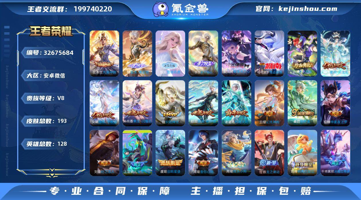 安卓WX-V8-永恒钻石II段位-128英雄-193皮肤-1典藏皮肤-3无双-3珍品传说-13传说-48史诗 社交限制