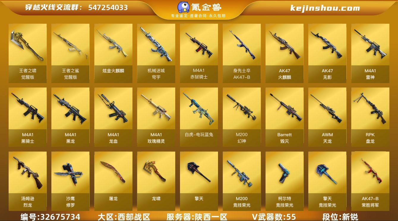 幻神3件套陕西一区-61V-3王者武器数-1炫金武器数 【热门武器】:M200-幻神,M200-竞技荣光,死亡之眼*2,白虎-电玩蓝兔,M4A1-黑骑士,汤姆逊-烈龙*5,RPK-盘龙*2,羊驼玩偶,USP-雷暴,沙鹰-修罗*3 【王者炫金武器】:炫金火麒麟,王者之魄闪光弹 【音效卡】:M200-幻神音效卡,M4A1-黑骑士音效卡,Barrett-毁灭音效卡,Barrett-碧霄极光音效卡*5,AWM-昌龙-怀旧音效卡*2 【皮肤】:幻神-降龙,雷神-荣耀之魄,雷神-烈虎皮肤,雷神-宇航兔皮肤,火麒麟-平天大圣,毁灭-暗月,毁灭-荣耀之怒,毁灭耀金皮肤,毁灭-黑大圣皮肤,毁灭-神秘黑洞皮肤,无影-能量核心,黑武士-典韦皮肤,战神-紫绶金章皮肤,战神-流金岁月皮肤*2,AK47-B-常胜将军-曹操,AK47-B-常胜将军-刘备*2,AK47-B-常胜将军-孙权,修罗-能量核心*2 【角色】:瞳,魅影,电竞教官-云悠悠,零·纪元,战地猎狐,王者-魅影,暗夜-X,初恋灵狐,嘉年华灵狐,龙儿,麻雀,曼陀罗-X,曼陀罗-礼服,潘多拉-X,潜龙队-X,青霞仙子,铁骑-乘风破浪,铁骑荣耀,兔囡囡,雪莉杨,樱-缤纷夏日,影武者-X,职业选手 【人偶武器】:天龙-曼陀罗,M4A1-雷神-精英刀锋,AWM-灵狐-15周年嘉年华,夺魂,闪光弹-小乔,闪光弹-貂蝉,...