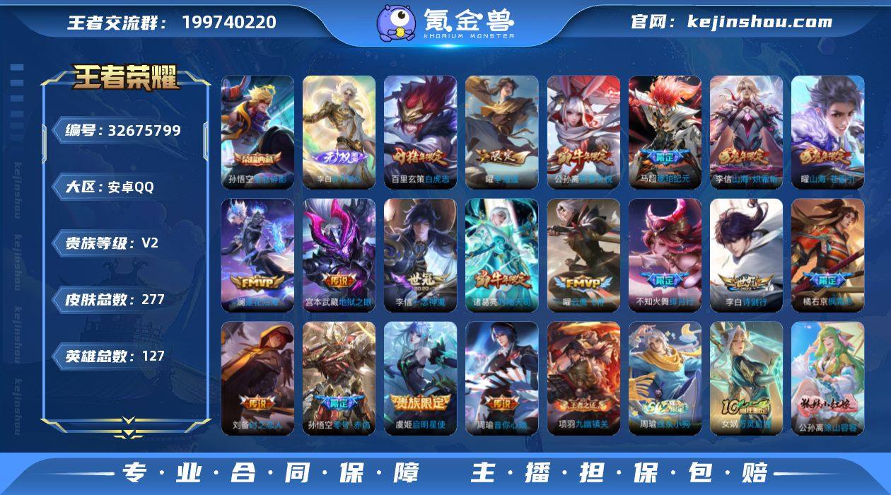 安卓Q-V2-最强王者段位-127英雄-277皮肤-1典藏皮肤-1无双-18传说-82史诗 【英雄全皮】:橘右京全皮 【荣耀典藏】:孙悟空全息碎影 【无双皮肤】:李白碎月剑心 【传说皮肤】:马超琥珀纪元,澜逐花归海,曜山海苍雷引,李信山海炽霜斩,李白诗剑行,不知火舞绯月行,橘右京枫霜尽,曜李逍遥 ,周瑜音你心动,公孙离祈雪灵祝,诸葛亮时雨天司,虞姬启明星使,孙悟空零号赤焰,曜云鹰飞将,李信一念神魔,刘备时之恋人,百里玄策白虎志,宫本武藏地狱之眼 【限定皮肤】:姜子牙天穹之誓,狄仁杰阴阳师,赵云皇家上将,墨子神迹守卫,嬴政优雅恋人,高渐离玩趣恶龙,阿轲迷踪丽影,钟无艳超时空战士,孙膑天狼运算者,芈月白晶晶,元歌云间偶戏,元歌无心,甄姬落雪兰心,马可波罗逐梦之星,马可波罗暗影游猎,狄仁杰魔术师,狄仁杰万华元夜,达摩星际陆战队,达摩沙漠行僧,项羽海滩派对,老夫子醍醐杖,老夫子航海奇遇记,关羽冰锋战神,程咬金演武夺筹,刘邦夺宝奇兵,韩信飞衡,不知火舞绯月行,橘右京枫霜尽,亚瑟潮玩骑士王,孙悟空大圣娶亲,孙悟空零号赤焰,孙悟空孙行者,李元芳云中旅人,虞姬霸王别姬,虞姬启明星使,钟馗驱傩正仪,干将莫邪冰霜恋舞曲,雅典娜单词大...