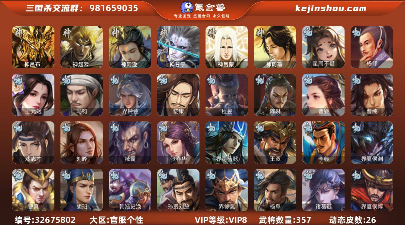 【4554】官阶:大将军;VIP等级:VIP8;史诗武将数量:37;动态皮肤数量:26;武将总数:357;史诗宝珠数量:50;将魂数量:76;神将:4;魏国史诗武将:18;蜀国史诗武将:7;吴国史诗武将:5;群史诗武将:10