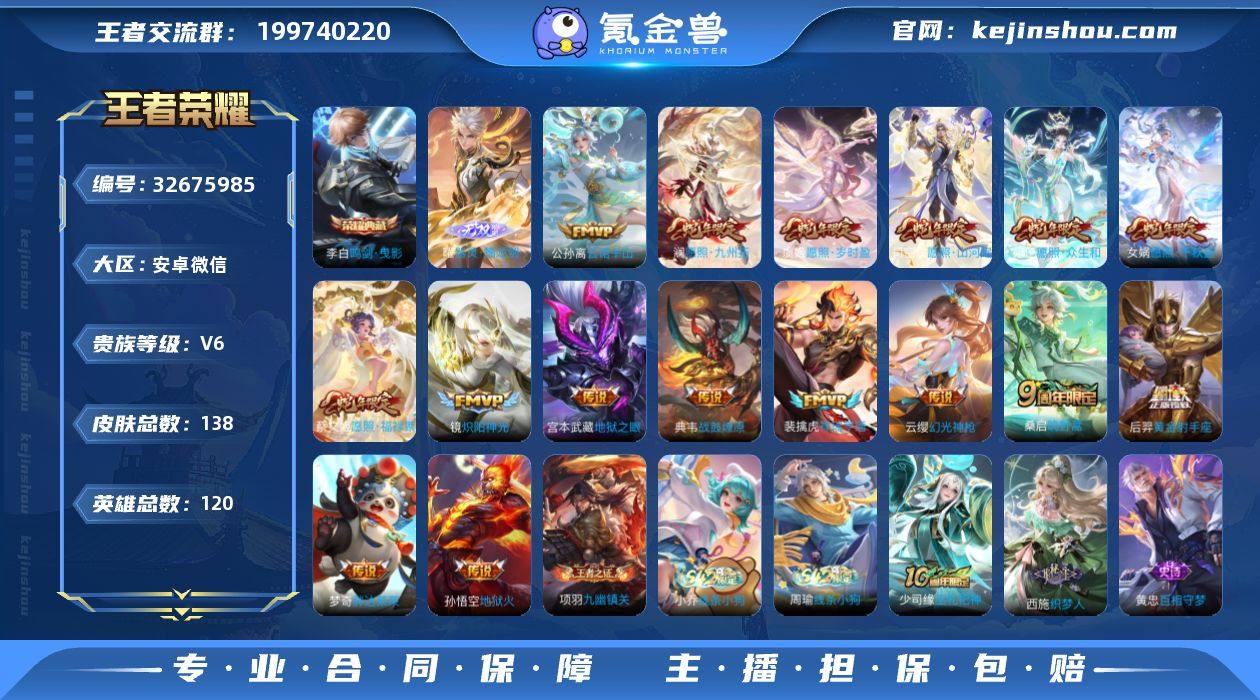 安卓WX-V6-最强王者段位-120英雄-138皮肤-1典藏皮肤-1无双-16传说-37史诗