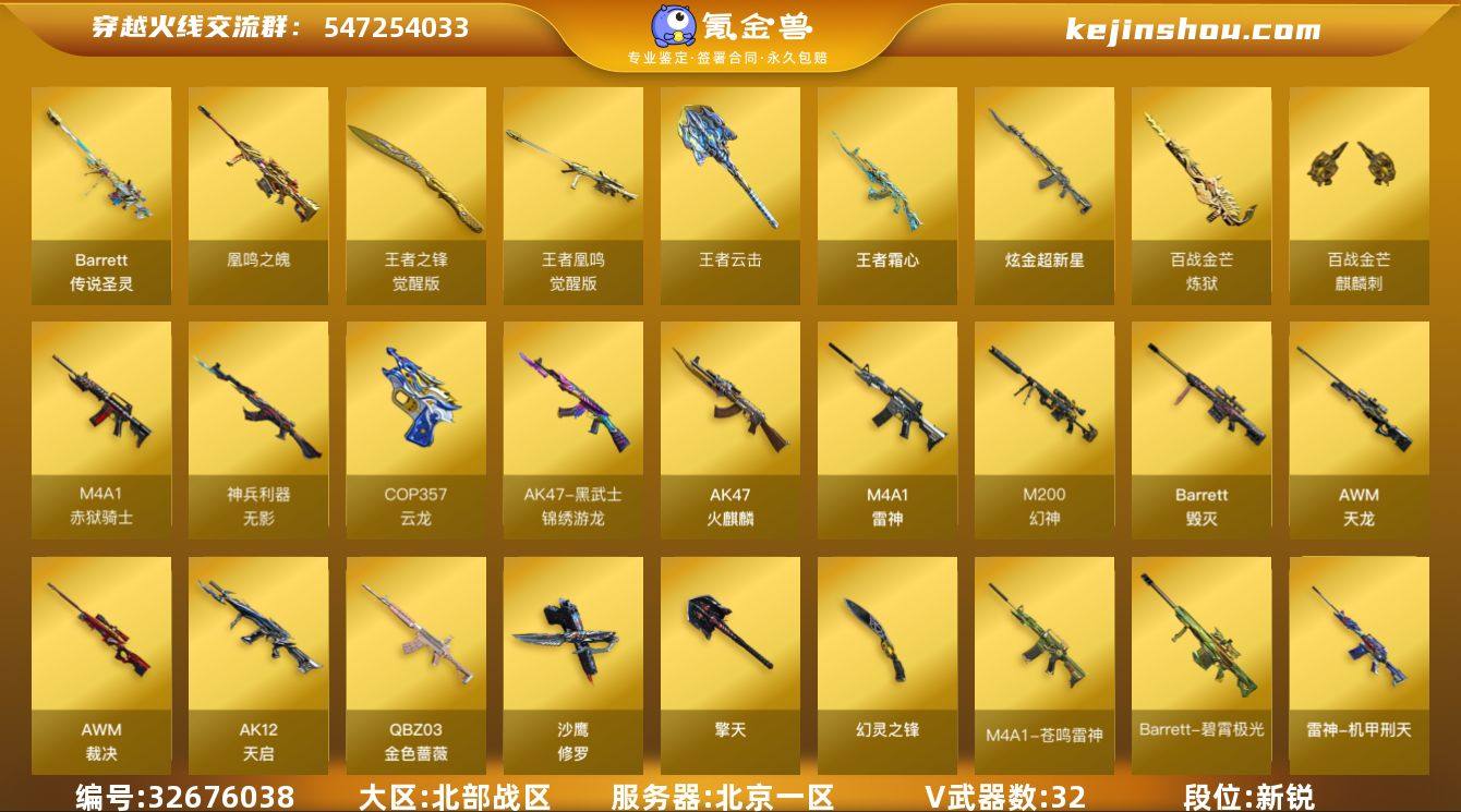 北京一区-33V-6王者-1炫金 【传说武器】:传说圣灵 【传说角色】:传说女帝 【热门武器】:传说圣灵,QBZ03-金色蔷薇,M4A1-青龙,M200-幻神,金色蔷薇-空,羊驼玩偶,沙鹰-修罗*2 【王者炫金武器】:王者霜心,凰鸣之魄,王者云击,炫金超新星 【音效卡】:Barrett-毁灭音效卡,Barrett-碧霄极光音效卡,炼狱-百战金芒-庆典舞曲音效卡 【皮肤】:幻神-降龙,幻神-动感闪耀 皮肤,裁决-运输船 皮肤,雷神-机甲刑天皮肤,M4A1-再燃火线,火麒麟-平天大圣,火麒麟-心动糖果,毁灭-英雄计划 皮肤,M4A1-千变-孔明皮肤,黑龙-能量核心,天启-高能霹雳 皮肤,屠龙-惊鸿 皮肤,轻型军用手斧-再燃火线,擎天-秘银 【角色】:王者-救世主,王者潘多拉,王者沙漠玫瑰,飞虎队-X,风暴女,嘉年华灵狐,灵狐者-X,灵狐者-七夕宝贝,潘多拉-甜心教官,斯沃特-X,雪莉杨-摸金校尉 【人偶武器】:M4A1-雷神-精英刀锋,金色蔷薇-空,街机小灰机,AWM-灵狐-15周年嘉年华*2,黄金迷你深渊冰龙,迷你裂空之翼,迷你波特博士*4,夺魂,迷你火种*4 【暴走生化】:超级对讲机 【挑战大师】:激光毁灭者III,机甲撕裂者III,神圣爆裂者-末日III 【英雄级武器】:AK47-火麒麟,M4A1-雷神*2,AK12-天启...