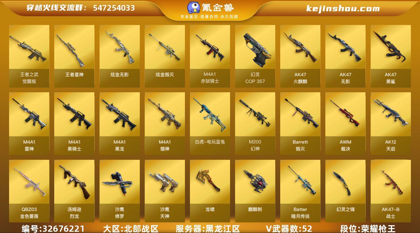 【店主推荐/有二次/秒换绑】幻神三件套!黑龙江区-57V-3王者武器数-2炫金武器数 【热门武器】:王者星神,QBZ03-金色蔷薇,M200-幻神,死亡之眼,白虎-电玩蓝兔,毒蜂,M4A1-黑骑士,汤姆逊-烈龙*6,雷神-小红,COP 357-幻灵,沙鹰-修罗 【王者炫金武器】:王者星神,烟雾弹-雷霆王者,炫金无影,炫金毁灭 【音效卡】:M200-幻神音效卡,AK47-火麒麟音效卡,M4A1-黑骑士音效卡,Barrett-毁灭音效卡,N9语音包,Barrett-碧霄极光音效卡 【皮肤】:幻神-周瑜皮肤,雷神-暗月,雷神-能量核心,雷神-虎将,火麒麟-华夏之心,毁灭-黑大圣皮肤,毁灭-神秘黑洞皮肤,黑龙-能量核心,黑骑士-电玩青兔皮肤,AK47-黑武士-361,战神-粉色甜心皮肤,战神-流金岁月皮肤*3,AK47-B-常胜将军-曹操,AK47-B-常胜将军-孙权*2 【角色】:樱,荒漠琉璃,零·纪元,战地猎狐,修道士,暗夜-X,初恋灵狐,风暴女*2,嘉年华灵狐,灵狐者-X,灵狐者-黄金海岸,潘多拉-X,潜龙队-X,蜀雪,铁骑荣耀,新娜塔莎,影武者-X,游珑儿,职业选手 【人偶武器】:雷神-小红,AWM-灵狐-15周年嘉年华,迷你深渊冰龙,迷你裂空之翼*7,夺魂*3,迷你牛牛,迷你生化手雷,深渊终结者手雷,闪光弹-小乔,迷你艾比,迷...