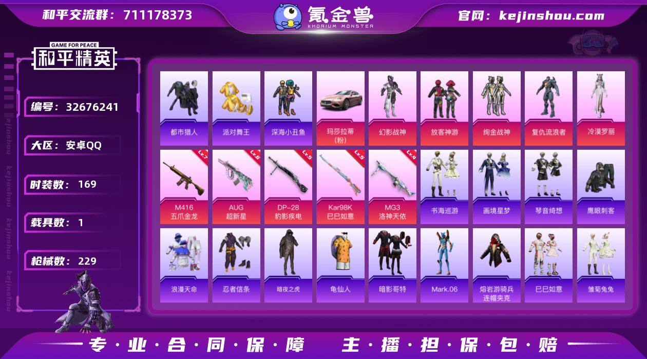 安卓 手Q-5粉装-8特效枪-1载具-5粉色飞行器-68166热力值-17王牌印记-169套装-229枪皮 【热门品类】:套装-浪漫天命,套装-都市猎人,套装-派对舞王,套装-深海小丑鱼,套装-忍者信条,套装-暗夜之虎,套装-龟仙人,套装-暗影哥特,角色-Mark.06,熔岩游骑兵连帽夹克 【粉色套装】:粉装-幻影战神,粉装-放客神游,粉装-绚金战神,角色-复仇流浪者,角色-冷漠罗丽 【粉色枪皮等级】:M416-五爪金龙(七级),AUG-超新星(六级),AKS-74U-森灵之息(五级),Kar98K-巳巳如意(五级),Mk14-福马献瑞(五级),DP-28-豹影疾电(五级),MG3-洛神天依(四级),PKM-萌骑夺宝(二级) 【粉色载具】:玛莎拉蒂Ghibli(粉) 【粉色枪皮】:M416-五爪金龙,AUG-超新星,AKS-74U-森灵之息,Kar98K-巳巳如意,Mk14-福马献瑞,DP-28-豹影疾电,MG3-洛神天依,PKM-萌骑夺宝 【粉色飞行器】:炫彩糖果飞行器,齐天大圣飞行器,梦幻舞会飞行器,镜光幻境飞行翼 【粉色降落伞】:星之彼岸降落伞,洛神天依降落伞,甜梦小狐降落伞,拂晓神骑降落伞,江南烟雨降落伞,初号机 觉醒Ver.降落伞,拳皇·狂花道降落伞,鬼刀降落伞,幻影飞狐降落伞,智耀战神降落伞,冷漠罗丽降落伞,荧海星豚降落伞,绯穹魔姬降落伞...