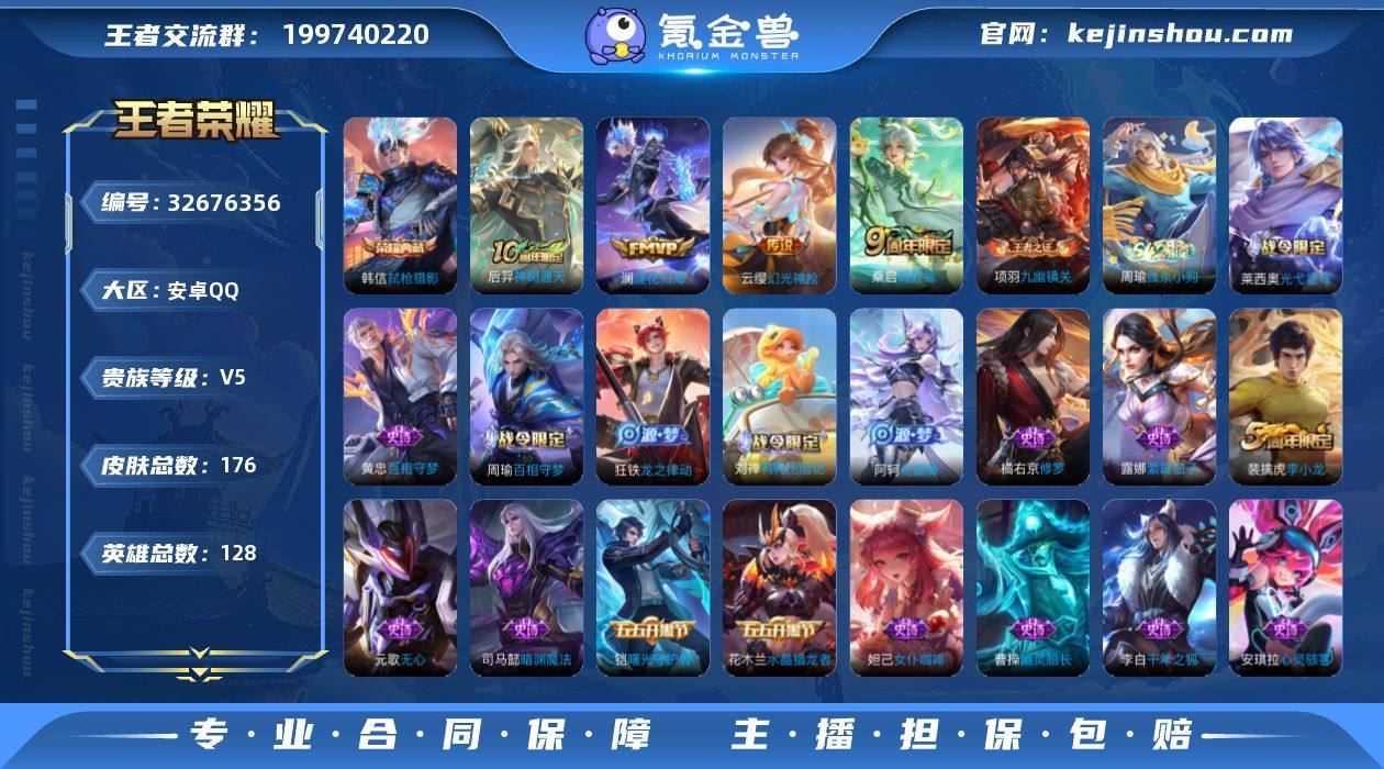 安卓Q-V5-至尊星耀V段位-128英雄-176皮肤-1典藏皮肤-4传说-41史诗 【荣耀典藏】:韩信弑枪猎影 【传说皮肤】:后羿神树通天,云缨幻光神枪,桑启鸣野蒿,澜逐花归海 【限定皮肤】:蒙犽顽岩魄,姜子牙天穹之誓,狄仁杰阴阳师,赵云皇家上将,嬴政优雅恋人,孙尚香蔷薇恋人,元歌无心,项羽海滩派对,李元芳云中旅人,蔡文姬繁星吟游,百里玄策原初追逐者,裴擒虎李小龙,裴擒虎擒涛扼浪,鲁班大师探海日志,桑启海盐诗旅,阿古朵江河有灵,张良古海寻踪,鬼谷子天穹祈灯,刘邦剑破天穹,程咬金群星魔术团,项羽苍威无极,周瑜熔金海岸 【赛季限定】:李元芳云中旅人,桑启海盐诗旅,裴擒虎擒涛扼浪,鲁班大师探海日志,张良古海寻踪,鬼谷子天穹祈灯,刘邦剑破天穹,姜子牙天穹之誓,东皇太一噬灭天穹,太乙真人谧流熔炉,钟馗虚灵犬护,甄姬逆浪荇歌,亚瑟荣光之誓,百里玄策原初追逐者,项羽九幽镇关 【战令限定】:项羽苍威无极,孙膑茶境仙,马超访茗客,刘禅鸭鸭历险记,沈梦溪鸭鸭历险记,周瑜百相守梦,孙策百相守梦,莱西奥光弋星穹,明世隐往忆晖光,周瑜线条小狗 【史诗皮肤】:露娜紫霞仙子,赵云皇家上将,赵云未来纪元,貂蝉圣诞恋歌,宫本武藏鬼剑武藏,孙尚香...