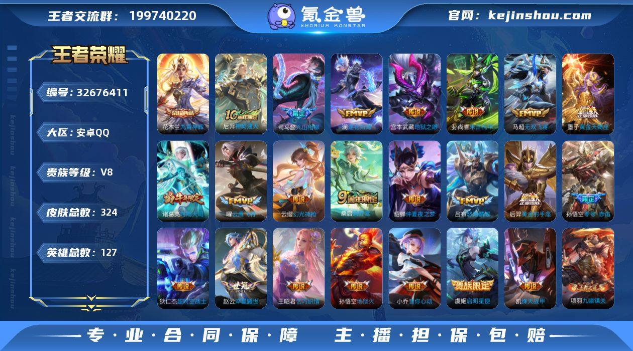 安卓Q-V8-最强王者段位-127英雄-324皮肤-1典藏皮肤-22传说-78史诗 【英雄全皮】:孙权全皮,影全皮,海诺全皮 【荣耀典藏】:花木兰九霄神辉 【传说皮肤】:后羿神树通天,司马懿九山相柳,云缨幻光神枪,桑启鸣野蒿,墨子黄金天蝎座,澜逐花归海,吕布怒海麟威,马超无双飞将,赵云淬星耀世,王昭君乞巧织情,小乔音你心动,诸葛亮时雨天司,铠绛天战甲,虞姬启明星使,孙悟空零号赤焰,曜云鹰飞将,后羿黄金射手座,貂蝉仲夏夜之梦,孙尚香末日机甲,宫本武藏地狱之眼,孙悟空地狱火,狄仁杰超时空战士 【限定皮肤】:暃埋骨钱,蒙犽顽岩魄,蔡文姬夏日便利店,大乔绒语心约,虞姬夏日便利店,姜子牙天穹之誓,杨戬破阵退雄兵,狄仁杰阴阳师,赵云皇家上将,赵云引擎之心,孙尚香蔷薇恋人,鲁班七号狮舞东方,钟无艳超时空战士,元歌云间偶戏,甄姬落雪兰心,典韦蓝屏警告,狄仁杰魔术师,狄仁杰万华元夜,达摩沙漠行僧,项羽海滩派对,老夫子醍醐杖,程咬金演武夺筹,兰陵王驯魔猎人,兰陵王金庭之子,孙悟空至尊宝,孙悟空大圣娶亲,孙悟空零号赤焰,孙悟空孙行者,李元芳云中旅人,虞姬启明星使,钟馗驱傩正仪,鬼谷子原初探秘者,诸葛亮时雨天司,苏烈千军破阵,百里玄...