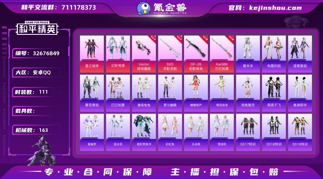 安卓 手Q-2粉装-6特效枪-0载具-3粉色飞行器-48475热力值-8王牌印记-111套装-163枪皮 【粉色套装】:粉装-星之彼岸,粉装-幻彩电音 【粉色枪皮等级】:UMP45-萌骑冒险(四级),Vector-绯穹魔姬(七级),Kar98K-巳巳如意(五级),Mk14-福马献瑞(三级),SVD-月影灵韵(七级),DP-28-豹影疾电(五级) 【粉色枪皮】:UMP45-萌骑冒险,Vector-绯穹魔姬,Kar98K-巳巳如意,Mk14-福马献瑞,SVD-月影灵韵,DP-28-豹影疾电 【粉色飞行器】:炫彩糖果飞行器,星夜魔法师飞行翼,萌物绒绒飞行器 【粉色降落伞】:第五大道降落伞,蜜语绒猫降落伞,鬼刀降落伞,幻彩电音降落伞,荧海星豚降落伞,炫彩糖果降落伞,虎痴许褚降落伞,千仞雪降落伞 【稀有套装】:套装-巳巳如意,套装-炫彩糖果,套装-马上有钱,套装-雏菊兔兔,套装-萝兰蝴蝶,套装-糖糖葫芦,套装-青团波波,角色-俏兔智灵,套装-燕燕于飞,套装-鱼渊荷华,套装-紫幽梦,套装-蓝冰羽,套装-星影赞美诗,套装-彩虹兔,套装-云朵鹅,套装-雪绒豹,套装-朱霞炽焰,套装-凌霄紫焰,套装-擎苍青焰,玩偶服-喜羊羊,套装-雨过天青,套装-红釉青花,角色-朱竹清 【稀有枪皮】:AKM-彩虹符号,AKM-破晓战魂,AKM-龙的传人,M16A4-红色方程式...