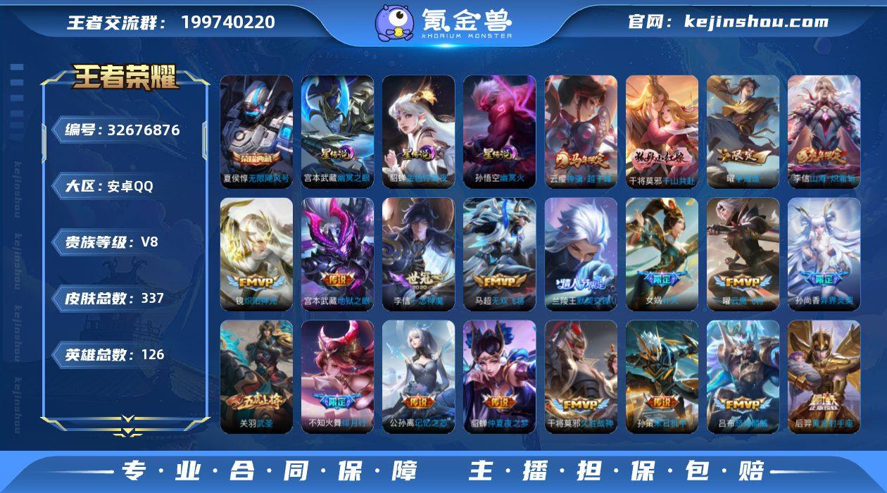 安卓Q-V8-至尊星耀I段位-126英雄-337皮肤-1典藏皮肤-28传说-110史诗 【英雄全皮】:刘禅全皮,敖隐全皮,空空儿全皮 【荣耀典藏】:夏侯惇无限飓风号 【传说皮肤】:云缨神骥越千峰,干将莫邪千山共赴,公孙离记忆之芯,干将莫邪画中仙,李信山海炽霜斩,吕布怒海麟威,不知火舞绯月行,百里守约碎云,马超无双飞将,女娲补天,孙策末日机甲,孙尚香异界灵契,曜李逍遥 ,兰陵王默契交锋,铠绛天战甲,镜炽阳神光,虞姬启明星使,孙悟空零号赤焰,关羽武圣,曜云鹰飞将,李信一念神魔,张良黄金白羊座,干将莫邪久胜战神,花木兰冠军飞将,后羿黄金射手座,貂蝉仲夏夜之梦,宫本武藏地狱之眼,孙悟空地狱火 【限定皮肤】:姜子牙天穹之誓,狄仁杰阴阳师,廉颇寅虎御盾,赵云皇家上将,赵云引擎之心,墨子神迹守卫,嬴政优雅恋人,孙尚香异界灵契,庄周高山流水,钟无艳超时空战士,扁鹊奇幻香踪,白起夜都怪侠,芈月幻夜卜梦,元歌云间偶戏,元歌无心,甄姬游园惊梦,甄姬落雪兰心,马可波罗山海玄木吟,狄仁杰魔术师,狄仁杰万华元夜,达摩沙漠行僧,项羽海滩派对,老夫子航海奇遇记,关羽武圣,关羽百相守梦,程咬金演武夺筹,韩信傲雪梅枪,王昭君午后时光,兰陵王默契交锋...