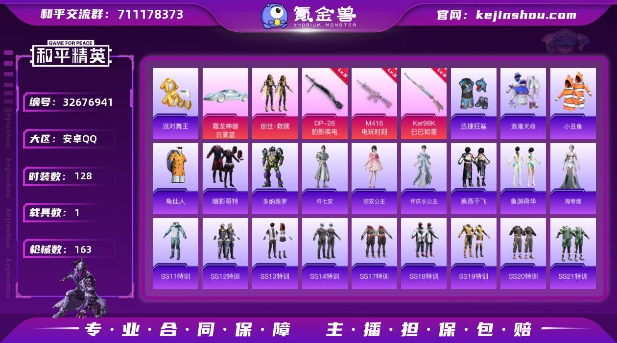 安卓 手Q-1粉装-7特效枪-1载具-1粉色飞行器-48574热力值-5王牌印记-128套装-163枪皮 【热门品类】:套装-浪漫天命,套装-派对舞王,套装-小丑鱼,套装-龟仙人,套装-暗影哥特 【粉色套装】:套装-创世·救赎 【粉色枪皮等级】:M416-电玩时刻(五级),UMP45-萌骑冒险(四级),AKS-74U-森灵之息(五级),Kar98K-巳巳如意(四级),Mk14-福马献瑞(五级),AA12-G-萌骑幻想(三级),DP-28-豹影疾电(五级) 【粉色载具】:霜龙神御(云雾蓝) 【粉色枪皮】:M416-电玩时刻,UMP45-萌骑冒险,AKS-74U-森灵之息,Kar98K-巳巳如意,Mk14-福马献瑞,AA12-G-萌骑幻想,DP-28-豹影疾电 【粉色飞行器】:炫彩糖果飞行器 【粉色降落伞】:锦绣火鲤降落伞,夏日绵绵冰降落伞,星夜魔法师降落伞,精灵梦叶罗丽降落伞,墨龙九天降落伞,忍者神龟降落伞,临安公主降落伞,绯穹魔姬降落伞,无垠阁降落伞,极意拳锋降落伞,炫彩糖果降落伞 【稀有套装】:套装-龟仙人,套装-雪国风尚,套装-炫彩糖果,套装-马上有钱,角色-多纳泰罗,角色-许七安,角色-临安公主,角色-怀庆长公主,套装-燕燕于飞,套装-鱼渊荷华,角色-海琴烟,套装-雨过天青,套装-红釉青花 【稀有枪皮】:AKM-夜灯,AKM-奇异狩猎者,AKM...