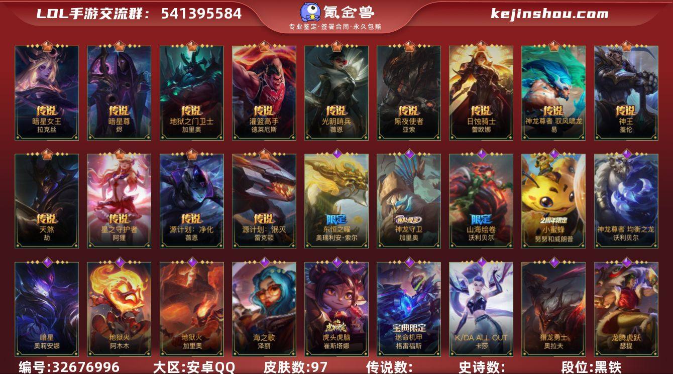 实名: 可修改 段位: 黑铁 皮肤数: 97 限定皮肤: 山海绘卷狗熊 传说皮: 暗星尊,地狱之门卫士,灌篮高手,光明哨兵薇恩,黑夜使者亚索,日蚀骑士蕾欧娜,神龙尊者 驭风啸龙,神王盖伦,天煞劫,星之守护者阿狸,源计划:净化,源计划:泯灭,暗星女王拉克丝 亮点: 【LSC556】76英雄/97皮肤/荣耀黄金/山海绘卷狗熊/神王盖伦/暗星女王拉克丝/源计划:净化/光明哨兵薇恩/暗星尊/黑夜使者亚索/星之守护者阿狸/天煞劫/日蚀骑士蕾欧娜/神龙尊者 驭风啸龙/灌篮高手/地狱之门卫士/源计划:泯灭/地狱火阿木木/小蜜蜂努努和威朗普/暗星发条/猛虎下山/圣龙/东恒之曜奥瑞利安索尔/腥红之月卡牌/K/DA ALL OUT卡莎/玉剑传说 苍鸾/幻梦甜心阿狸/未来战士卢锡安/小恶魔/虎头虎脑/小蜜蜂提莫/招财进宝/驯龙女巫/源计划:裁决/神龙尊者 均衡之龙 沃利贝尔/奈落之炎/海之歌泽丽/龙腾虎跃腕豪/绝命机甲男枪/破败军团德莱文/暗星墨菲特/虚空海灵/绒毛/暗星韦鲁斯/源代码索拉卡/地狱火加里奥/霸天战鹰加里奥/神龙守卫加里奥/天启骑士/猎龙勇士奥拉夫/未来战士慎/泳池派对鳄鱼/真实伤害赛娜/盗梦暗影/宇航员/s1光耀之刃/s5绯金魅影/s8绯金鮫灵/s9王牌舰长/s10王牌上将/S11王牌勇将/s11王牌司令/s12龙冕先锋/s13龙冕...
