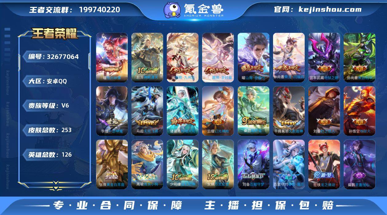 安卓Q-V6-至尊星耀II段位-126英雄-253皮肤-1典藏皮肤-16传说-72史诗 【英雄全皮】:影全皮 【荣耀典藏】:瑶拾光映像 【传说皮肤】:后羿神树通天,澜愿照九州拓,虞姬愿照岁时盈,云缨幻光神枪,桑启鸣野蒿,孙尚香乘龙问璇玑,曜山海苍雷引,马超无双飞将,诸葛亮时雨天司,李信一念神魔,刘备时之恋人,张良黄金白羊座,干将莫邪久胜战神,孙尚香末日机甲,宫本武藏地狱之眼,孙悟空地狱火 【限定皮肤】:姜子牙天穹之誓,狄仁杰阴阳师,赵云皇家上将,赵云百木心枪,孙尚香蔷薇恋人,庄周高山流水,高渐离玩趣恶龙,元歌云间偶戏,元歌无心,夏侯惇朔风刀,甄姬游园惊梦,马可波罗暗影游猎,狄仁杰魔术师,狄仁杰万华元夜,达摩沙漠行僧,项羽海滩派对,老夫子醍醐杖,程咬金演武夺筹,韩信傲雪梅枪,兰陵王金庭之子,花木兰青春决赛季,花木兰默契交锋,亚瑟潮玩骑士王,孙悟空至尊宝,孙悟空大圣娶亲,刘备百相守梦,李元芳云中旅人,钟馗驱傩正仪,雅典娜单词大作战,蔡文姬繁星吟游,鬼谷子原初探秘者,鬼谷子五谷丰年,诸葛亮时雨天司,苏烈千军破阵,弈星混沌棋,梦奇顽趣,公孙离玉兔公主,沈梦溪大漠名商,明世隐疑决卦,裴擒虎李小龙,裴擒虎擒涛扼浪,云中君纤...