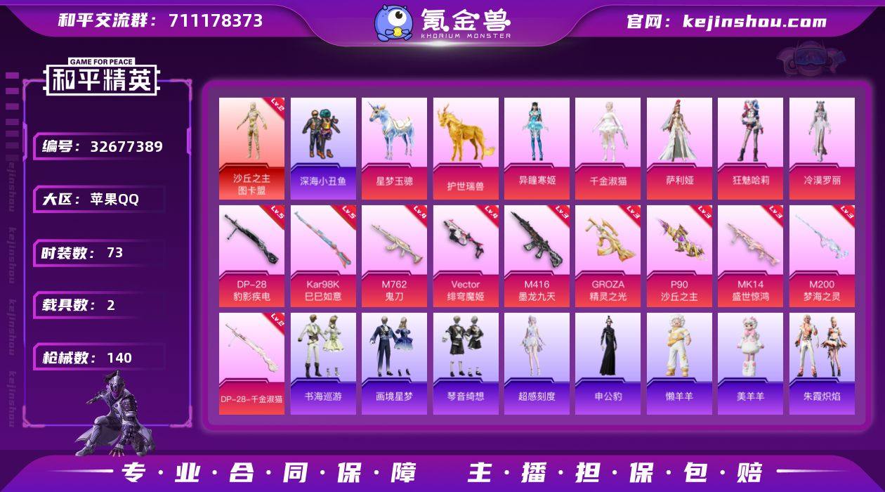 苹果 【红装号 沙丘之主-图卡盟(二级)/M416-墨龙九天(三级)/GROZA-精灵之光(三级)/角色-千金淑猫】手Q-1神装-5粉装-12特效枪-2载具-12粉色飞行器-47945热力值-7王牌印记-73套装-140枪皮 【红色神装等级】:沙丘之主-图卡盟(二级) 【红色角色神装】:沙丘之主-图卡盟 【热门品类】:套装-深海小丑鱼,角色-六号稻草人 【粉色套装】:角色-千金淑猫,角色-萨利娅,角色-狂魅哈莉,角色-冷漠罗丽,角色-异瞳寒姬 【粉色枪皮等级】:M416-墨龙九天(三级),GROZA-精灵之光(三级),M762-鬼刀(四级),Vector-绯穹魔姬(四级),AKS-74U-森灵之息(五级),P90-沙丘之主(三级),Kar98K-巳巳如意(五级),Mk14-盛世惊鸿(三级),Mk14-福马献瑞(二级),M200-梦海之灵(三级),DP-28-千金淑猫(二级),DP-28-豹影疾电(五级) 【粉色载具】:星梦玉骢,护世瑞兽 【粉色枪皮】:M416-墨龙九天,GROZA-精灵之光,M762-鬼刀,Vector-绯穹魔姬,AKS-74U-森灵之息,P90-沙丘之主,Kar98K-巳巳如意,Mk14-盛世惊鸿,Mk14-福马献瑞,M200-梦海之灵,DP-28-千金淑猫,DP-28-豹影疾电 【粉色飞行器】:酣梦熊熊飞行器,香车宝马飞行器,炫彩糖果飞行器,千面幻镜飞行器,沙丘之主天马,镜域双华-灵镜之阶,龙...