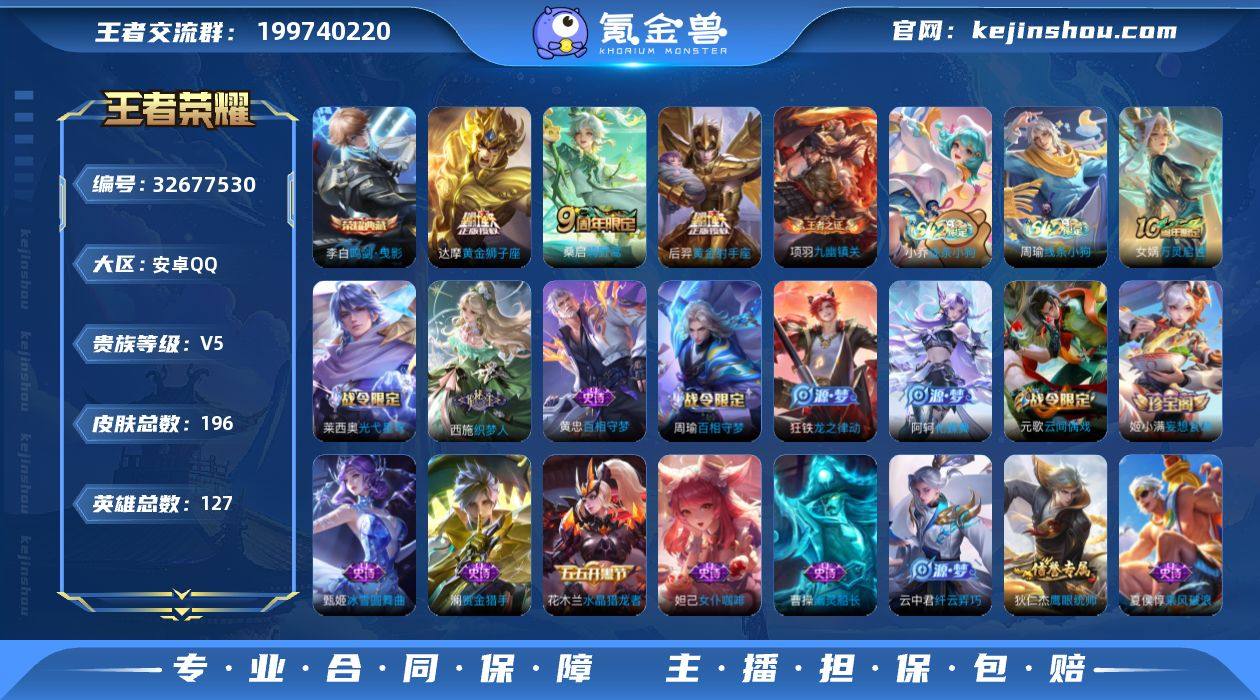 安卓Q-V5-至尊星耀III段位-127英雄-190皮肤-1典藏皮肤-2传说-41史诗 【英雄全皮】:孙权全皮,空空儿全皮 【荣耀典藏】:李白鸣剑曳影 【传说皮肤】:桑启鸣野蒿,达摩黄金狮子座 【限定皮肤】:姜子牙天穹之誓,杨戬破阵退雄兵,狄仁杰阴阳师,赵云皇家上将,元歌云间偶戏,达摩沙漠行僧,项羽海滩派对,兰陵王金庭之子,沈梦溪大漠名商,云中君纤云弄巧,上官婉儿梁祝,鲁班大师探海日志,艾琳流音漫舞,阿古朵江河有灵,张良古海寻踪,蒙犽百解令,鬼谷子天穹祈灯,姬小满妄想食味,沈梦溪龙舞盛年,刘邦剑破天穹,程咬金群星魔术团,周瑜熔金海岸 【赛季限定】:达摩沙漠行僧,兰陵王金庭之子,沈梦溪大漠名商,鲁班大师探海日志,张良古海寻踪,鬼谷子天穹祈灯,刘邦剑破天穹,姜子牙天穹之誓,太乙真人谧流熔炉,钟馗虚灵犬护,甄姬逆浪荇歌,亚瑟荣光之誓,牛魔星界战将,项羽九幽镇关 【战令限定】:元歌云间偶戏,艾琳流音漫舞,周瑜百相守梦,孙策百相守梦,莱西奥光弋星穹,明世隐往忆晖光,周瑜线条小狗,小乔线条小狗 【史诗皮肤】:赵云皇家上将,赵云未来纪元,貂蝉圣诞恋歌,甄姬冰雪圆舞曲,廉颇地狱岩魂,宫本武藏鬼剑武藏,孙尚香水果甜心,嬴政摇滚巨星,...