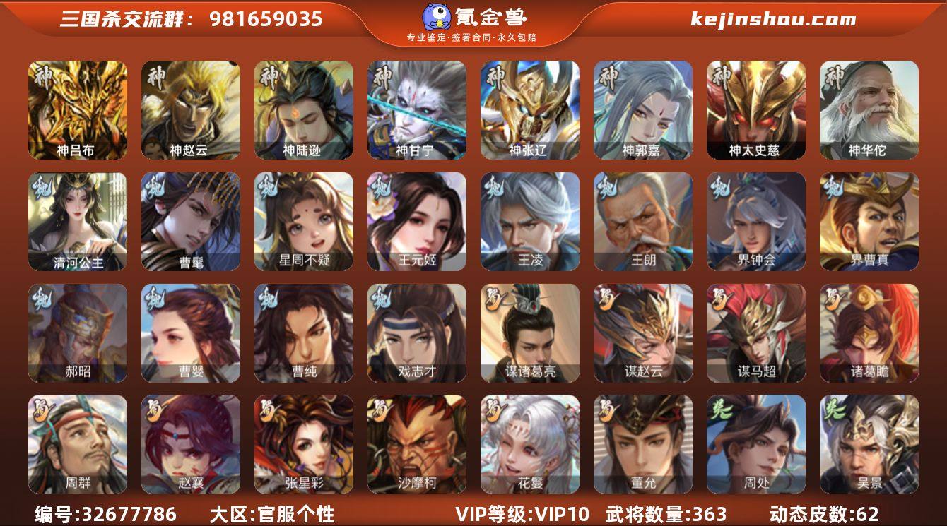 【123】官阶:大将军;VIP等级:VIP10;史诗武将数量:56;动态皮肤数量:62;武将总数:363;史诗宝珠数量:79;将魂数量:26000;神将:9;魏国史诗武将:23;蜀国史诗武将:10;吴国史诗武将:5;群史诗武将:20