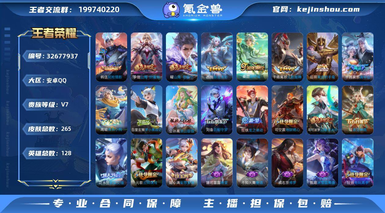 安卓Q-V7-至尊星耀V段位-128英雄-265皮肤-1典藏皮肤-7传说-70史诗 【英雄全皮】:孙权全皮,狂铁全皮,戈娅全皮,空空儿全皮,影全皮 【荣耀典藏】:韩信弑枪猎影 【传说皮肤】:桑启鸣野蒿,干将莫邪画中仙,曜山海苍雷引,李信山海炽霜斩,西施游龙清影,干将莫邪久胜战神,后羿黄金射手座 【限定皮肤】:姜子牙天穹之誓,狄仁杰阴阳师,赵云皇家上将,孙尚香蔷薇恋人,庄周高山流水,钟无艳王者之锤,扁鹊奇幻香踪,元歌云间偶戏,元歌无心,夏侯惇朔风刀,马可波罗山海玄木吟,狄仁杰魔术师,狄仁杰万华元夜,项羽海滩派对,老夫子醍醐杖,程咬金演武夺筹,花木兰默契交锋,亚瑟潮玩骑士王,牛魔御旌,刘备百相守梦,李元芳匿光侦查者,钟馗驱傩正仪,杨玉环遇见飞天,杨戬潮玩骑兵,干将莫邪画中仙,雅典娜黎明之约,鬼谷子原初探秘者,鬼谷子五谷丰年,弈星混沌棋,沈梦溪大漠名商,明世隐疑决卦,裴擒虎李小龙,裴擒虎擒涛扼浪,狂铁御狮,狂铁电玩高手,米莱狄御霄,云中君纤云弄巧,李信山海炽霜斩,盾山御銮,上官婉儿梁祝,嫦娥暖冬兔眠,曜山海苍雷引,西施玲珑珍味,鲁班大师探海日志,桑启海盐诗旅,暃星界游侠,戈娅驭风魔法,艾琳流音漫舞,司空震地狱燃心,...