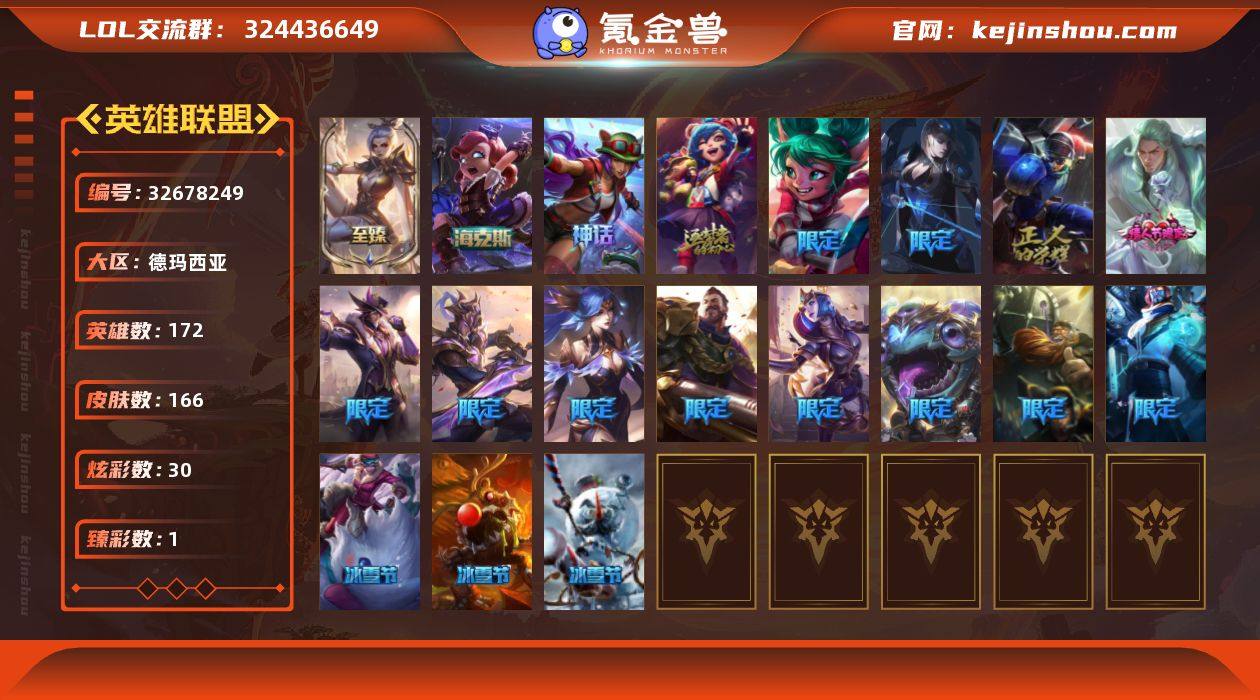 白银段位-172英雄-166皮肤-30炫彩-0终极-4神话-18限定-12传说-48史诗 【神话皮肤】:十周年纪念安妮,十五周年纪念希维尔 【至臻皮肤】:至臻玉剑传说武剑仙锐雯 【海克斯皮肤】:海克斯科技安妮 【臻彩皮肤】:无畏骑士瑟庄妮赤子初心 【情人节限定】:水晶玫瑰斯维因 【冰雪限定】:胡桃夹子萨科,雪默丁格,圣诞驯鹿克格莫,魄罗骑士瑟庄妮 【限定皮肤】:冠军之箭艾希,Fnatic古拉加斯,SKTT1瑞兹,胜利枪神格雷福斯,胜利女神奥莉安娜,胜利巨口克格莫,胜利女神娑娜,胜利剑圣易,胜利之运崔斯特,魅惑女巫奈德丽,波比的巧克力工坊,防暴天使凯尔 【传说皮肤】:烈焰雄心崔丝塔娜,西部天使艾希,鬼魂新娘莫甘娜,绅士科加斯,地狱行者孙悟空,神拳李青,炼狱魔犬内瑟斯,死亡骑士盖伦,泳池派对吉格斯,星之守护者金克丝,天煞劫,暗星锤石 【史诗皮肤】:冰霜烈焰安妮,安伯斯与提妮,皇家火枪手崔斯特,特战先锋赵信,地狱火阿利斯塔,月光女神阿忒弥斯索拉卡,火箭达人崔丝塔娜,刀锋女王莫甘娜,炼金狂士辛吉德,卡尔萨斯祸害之光,小小骑士阿木木,夜行义贼艾瑞莉娅,驯龙大师斯维因,霸天巨兽墨菲特,暗夜猫女卡特琳娜,符文战神雷克顿,腥红之月伊莉丝,斗战胜...