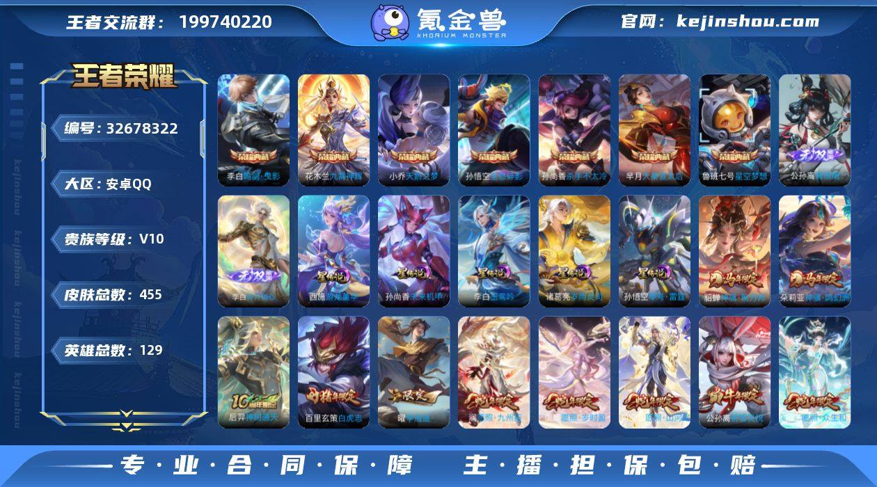 安卓Q-V10-最强王者段位-129英雄-455皮肤-7典藏皮肤-1典藏英雄-2无双-50传说-144史诗 【英雄全皮】:阿轲全皮,刘邦全皮,孙权全皮,敖隐全皮,影全皮,海诺全皮 【荣耀典藏】:武则天英雄,孙悟空全息碎影,小乔天鹅之梦,孙尚香杀手不太冷,鲁班七号星空梦想,芈月大秦宣太后,李白鸣剑曳影,花木兰九霄神辉 【无双皮肤】:李白碎月剑心,公孙离离恨烟 【传说皮肤】:朵莉亚神骥鸣幻洲,貂蝉神骥聚万邦,后羿神树通天,司空震愿照山河定,女娲愿照千秋盛,妲己愿照众生和,澜愿照九州拓,蔡文姬愿照福禄聚,虞姬愿照岁时盈,云缨幻光神枪,夏侯惇霜北刀,铠冥王哈迪斯,吕布曦玄引,孙策乘龙淬吴钩,赵云乘龙铭钟鼎,马超琥珀纪元,铠琥珀纪元,艾琳觅芳踪,吕布遇见神鼓,马可波罗妄想实况,东皇太一灼幽烈阳,伽罗炽翼辉光,马超无双飞将,女娲补天,西施游龙清影,曜李逍遥 ,兰陵王默契交锋,公孙离祈雪灵祝,诸葛亮时雨天司,铠绛天战甲,镜炽阳神光,虞姬启明星使,孙悟空零号赤焰,曜云鹰飞将,干将莫邪久胜战神,虞姬云霓雀翎,达摩黄金狮子座,百里玄策白虎志,花木兰冠军飞将,后羿黄金射手座,杨戬永曜之星,诸葛亮武陵仙君,貂蝉仲夏夜之梦,李白凤求凰,孙尚香...