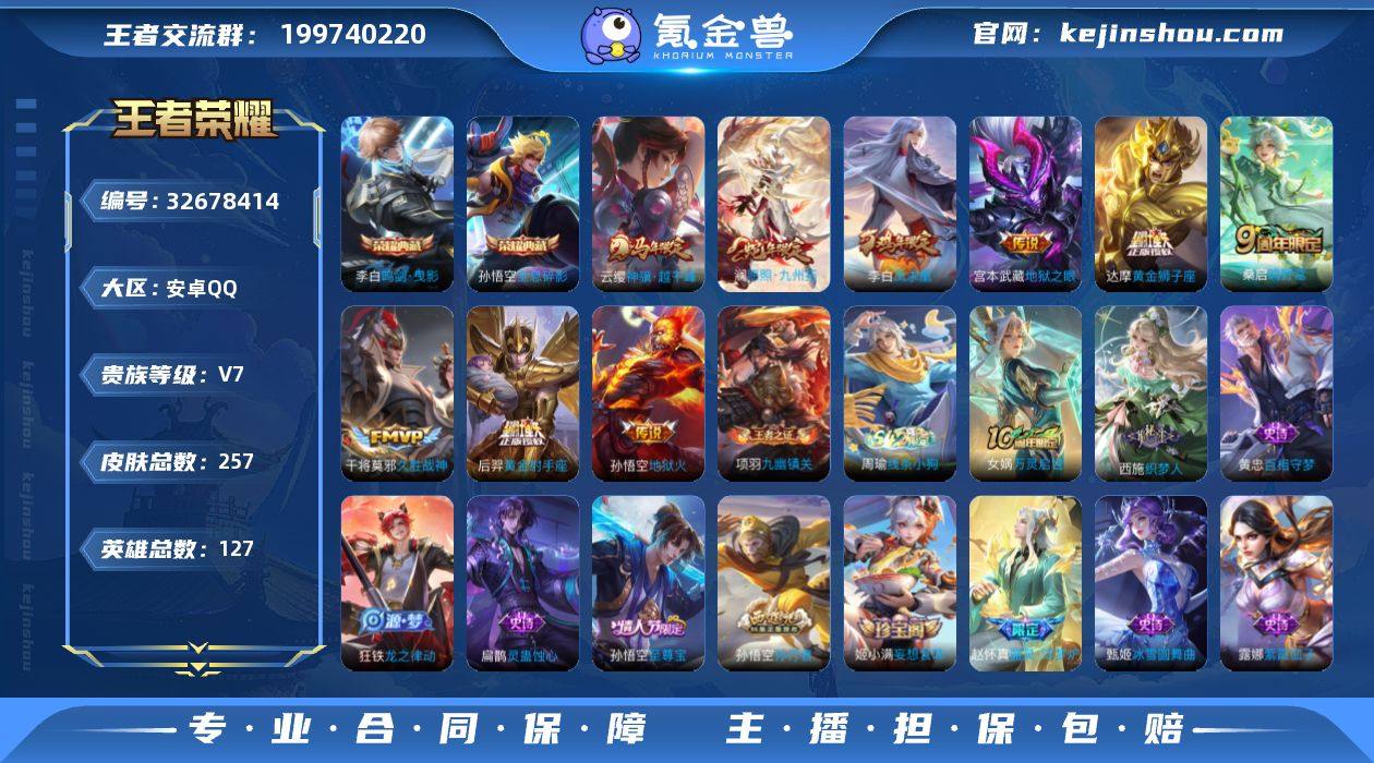 安卓Q-V7-最强王者段位-127英雄-257皮肤-2典藏皮肤-9传说-46史诗 【英雄全皮】:孙权全皮 【荣耀典藏】:孙悟空全息碎影,李白鸣剑曳影 【传说皮肤】:云缨神骥越千峰,澜愿照九州拓,桑启鸣野蒿,干将莫邪久胜战神,达摩黄金狮子座,后羿黄金射手座,李白凤求凰,宫本武藏地狱之眼,孙悟空地狱火 【限定皮肤】:白起狰,姜子牙天穹之誓,狄仁杰阴阳师,虞姬凯尔特女王,赵云皇家上将,孙尚香蔷薇恋人,庄周蜃楼王,庄周高山流水,高渐离死亡摇滚,高渐离玩趣恶龙,孙膑妖精王,扁鹊炼金王,芈月重明,元歌无心,曹操烛龙,典韦穷奇,狄仁杰魔术师,狄仁杰万华元夜,达摩沙漠行僧,项羽海滩派对,兰陵王金庭之子,亚瑟狮心王,孙悟空至尊宝,孙悟空孙行者,牛魔御旌,李元芳云中旅人,钟馗驱傩正仪,太乙真人饕餮,太乙真人华丽摇滚,鬼谷子五谷丰年,苏烈千军破阵,百里玄策原初追逐者,弈星混沌棋,沈梦溪大漠名商,明世隐疑决卦,裴擒虎李小龙,裴擒虎擒涛扼浪,狂铁御狮,米莱狄御霄,盾山御銮,上官婉儿梁祝,鲁班大师探海日志,桑启海盐诗旅,阿古朵江河有灵,张良古海寻踪,高渐离燃音魔法,妲己灵卜魔法,鬼谷子天穹祈灯,姬小满妄想食味,沈梦溪龙舞盛年,刘邦剑破天...