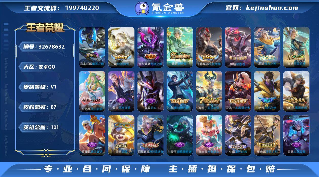 【aswz1493】安卓Q-V0-至尊星耀III段位-101英雄-87皮肤-4传说-23史诗 【英雄全皮】:孙权全皮 【传说皮肤】:桑启鸣野蒿,镜炽阳神光,干将莫邪久胜战神,宫本武藏地狱之眼 【限定皮肤】:姜子牙天穹之誓,狄仁杰阴阳师,赵云百木心枪,元歌无心,达摩沙漠行僧,项羽海滩派对,兰陵王金庭之子,李元芳云中旅人,雅典娜黎明之约,鬼谷子五谷丰年,百里玄策原初追逐者,梦奇顽趣,沈梦溪大漠名商,裴擒虎擒涛扼浪,鲁班大师探海日志,桑启海盐诗旅,张良古海寻踪,鬼谷子天穹祈灯,刘邦剑破天穹 【赛季限定】:达摩沙漠行僧,兰陵王金庭之子,沈梦溪大漠名商,李元芳云中旅人,桑启海盐诗旅,裴擒虎擒涛扼浪,鲁班大师探海日志,张良古海寻踪,鬼谷子天穹祈灯,刘邦剑破天穹,姜子牙天穹之誓,东皇太一噬灭天穹,甄姬逆浪荇歌,亚瑟荣光之誓,百里玄策原初追逐者,雅典娜黎明之约,梦奇顽趣,牛魔星界战将 【战令限定】:周瑜线条小狗 【史诗皮肤】:貂蝉圣诞恋歌,宫本武藏鬼剑武藏,孙尚香水果甜心,妲己魅力维加斯,花木兰水晶猎龙者,刘邦德古拉伯爵,夏侯惇乘风破浪,兰陵王暗隐猎兽者,亚瑟心灵战警,铠曙光守护者,狄仁杰鹰眼统帅,百里玄策原初追逐者,雅典娜黎明之约,...