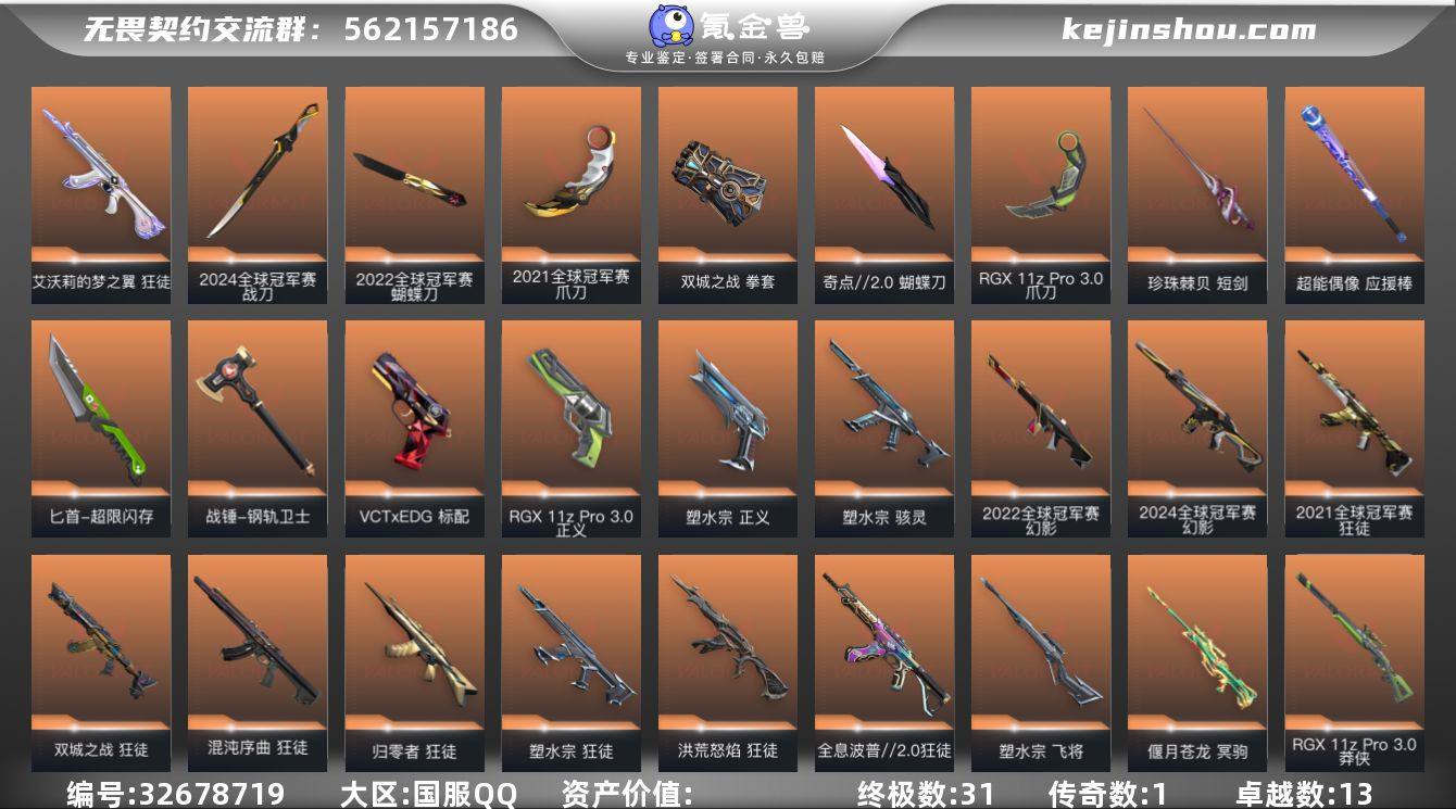 w4731 【精品号】22冠军套 班若2.0套 双城狂徒 双城拳套 掠影冥驹 掠影狂徒 奇点2.0蝴蝶刀 紫金戍卫 紫金爪刀 混沌狂徒 24冠军套 应援棒 显卡爪刀 显卡莽侠 全息2.0狂徒 猫猫狂徒 偃月冥驹 天御刀 洪荒狂徒 盖世狂徒 班若幻影 盖亚狂徒 21冠军套 威龙之刃 耀鳞狂徒 耀鳞鬼魅 归零者狂徒 塑水套 库存: 82680剩余VP:133剩余R点:30 段位:未定级