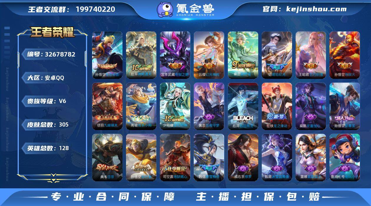 安卓Q-V6-最强王者段位-128英雄-305皮肤-1典藏皮肤-7传说-82史诗 【英雄全皮】:孙权全皮,戈娅全皮,空空儿全皮 【荣耀典藏】:孙悟空全息碎影 【传说皮肤】:后羿神树通天,云缨幻光神枪,桑启鸣野蒿,铠琥珀纪元,王昭君乞巧织情,宫本武藏地狱之眼,孙悟空地狱火 【限定皮肤】:蒙犽顽岩魄,大乔绒语心约,姜子牙天穹之誓,李白谪仙醉月,狄仁杰阴阳师,赵云皇家上将,庄周高山流水,高渐离玩趣恶龙,钟无艳超时空战士,扁鹊奇幻香踪,芈月幻夜卜梦,元歌无心,甄姬落雪兰心,典韦岱宗,狄仁杰魔术师,狄仁杰万华元夜,达摩沙漠行僧,项羽海滩派对,程咬金演武夺筹,韩信傲雪梅枪,兰陵王金庭之子,孙悟空美猴王,孙悟空至尊宝,孙悟空孙行者,李元芳银河之约,李元芳云中旅人,钟馗驱傩正仪,杨戬潮玩骑兵,女娲朔望之晖,干将莫邪胡桃夹子,鬼谷子五谷丰年,黄忠火炮绅士,苏烈千军破阵,百里玄策原初追逐者,沈梦溪大漠名商,裴擒虎李小龙,裴擒虎擒涛扼浪,云中君纤云弄巧,猪八戒西部大镖客,上官婉儿梁祝,嫦娥拒霜思,嫦娥暖冬兔眠,西施玲珑珍味,鲁班大师探海日志,桑启海盐诗旅,暃星界游侠,戈娅驭风魔法,艾琳女武神,艾琳流音漫舞,司空震地狱燃心,阿古朵江...