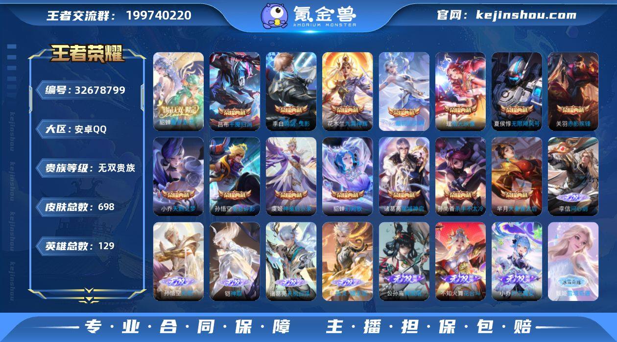 王者荣耀aq顶级游戏账号 万氪无畏契约 无双V10,腾讯官方认证超核玩家,荣耀王者,历史巅峰1911,绝版省级巅峰发育路,万战金标公孙离。 大量热门英雄全皮肤:李白、猴子、诸葛亮、孙策、吕布、后羿、赵云、镜、老虎、守约、花木兰等,法师辅助也齐全:大乔、瑶、妲己、王昭君等。 拥有3000+战令币,4月新战令返场直接抽。 超多动态无双签名、氪金局内特效,李信、猴子无双全特效,2个氪金马年灵宝,朵莉亚、关羽,5个近年传说天幕。 贵族积分65万+,累计氪金6万+,皮肤接近700,4月初活动后直接破700皮。 号内高亲密度好友多,带妹体验拉满。 捆绑无畏契约账号免费送 无畏契约氪金1万+,高品质枪皮、稀有刀皮齐全,历史超凡3,支持二次实名。