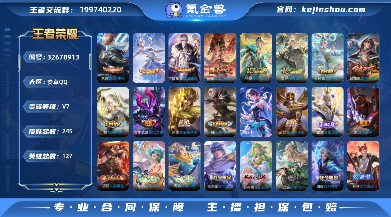 安卓Q-V7-最强王者段位-127英雄-245皮肤-3典藏皮肤-13传说-63史诗 【英雄全皮】:猪八戒全皮,影全皮 【荣耀典藏】:李白鸣剑曳影,诸葛亮星域神启,伽罗最初的交响 【传说皮肤】:貂蝉神骥聚万邦,杨戬纵目迁山,后羿神树通天,公孙离云诺千山,杨玉环星之鸣奏,嬴政玄雷天君,裴擒虎寅虎赤拳,铠绛天战甲,镜炽阳神光,曜云鹰飞将,达摩黄金狮子座,后羿黄金射手座,宫本武藏地狱之眼 【限定皮肤】:狄仁杰阴阳师,赵云皇家上将,孙尚香蔷薇恋人,庄周高山流水,高渐离玩趣恶龙,吕布御风骁将,元歌云间偶戏,夏侯惇朔风刀,典韦岱宗,马可波罗暗影游猎,狄仁杰魔术师,狄仁杰万华元夜,达摩沙漠行僧,项羽海滩派对,老夫子醍醐杖,关羽冰锋战神,程咬金演武夺筹,兰陵王金庭之子,亚瑟潮玩骑士王,孙悟空至尊宝,后羿辉光之辰,后羿圣弓游侠,李元芳银河之约,李元芳云中旅人,钟馗驱傩正仪,干将莫邪真爱魔法,雅典娜黎明之约,太乙真人华丽摇滚,鬼谷子原初探秘者,鬼谷子五谷丰年,苏烈千军破阵,百里玄策原初追逐者,弈星混沌棋,梦奇顽趣,沈梦溪星空之诺,沈梦溪大漠名商,明世隐疑决卦,裴擒虎李小龙,裴擒虎寅虎赤拳,裴擒虎擒涛扼浪,云中君纤云弄巧,盾山御銮,...