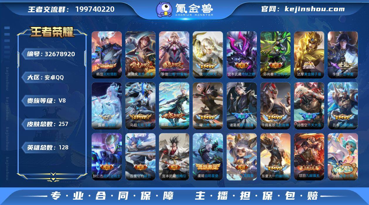 安卓Q-V8-最强王者段位-128英雄-257皮肤-1典藏皮肤-21传说-76史诗 【荣耀典藏】:韩信弑枪猎影 【传说皮肤】:赵云乘龙铭钟鼎,露娜霜月吟,宫本武藏惊梅引,东皇太一灼幽烈阳,诸葛亮鹤羽星尊,孙悟空齐天大圣,李信山海炽霜斩,吕布怒海麟威,百里守约碎云,马超无双飞将,裴擒虎寅虎赤拳,李元芳飞鸢探春,镜炽阳神光,虞姬启明星使,曜云鹰飞将,李信一念神魔,干将莫邪久胜战神,达摩黄金狮子座,孙尚香末日机甲,宫本武藏地狱之眼,狄仁杰超时空战士 【限定皮肤】:暃埋骨钱,姜子牙天穹之誓,杨戬破阵退雄兵,狄仁杰阴阳师,赵云皇家上将,赵云引擎之心,赵云龙胆,嬴政优雅恋人,孙尚香蔷薇恋人,庄周高山流水,钟无艳超时空战士,扁鹊奇幻香踪,芈月幻夜卜梦,元歌无心,甄姬落雪兰心,马可波罗山海玄木吟,狄仁杰魔术师,狄仁杰万华元夜,达摩沙漠行僧,项羽海滩派对,老夫子醍醐杖,韩信傲雪梅枪,王昭君午后时光,兰陵王金庭之子,孙悟空齐天大圣,李元芳云中旅人,虞姬启明星使,钟馗驱傩正仪,杨玉环遇见飞天,杨戬潮玩骑兵,雅典娜黎明之约,鬼谷子原初探秘者,鬼谷子五谷丰年,诸葛亮鹤羽星尊,黄忠火炮绅士,苏烈千军破阵,百里玄策原初追逐者,弈星混沌棋,...