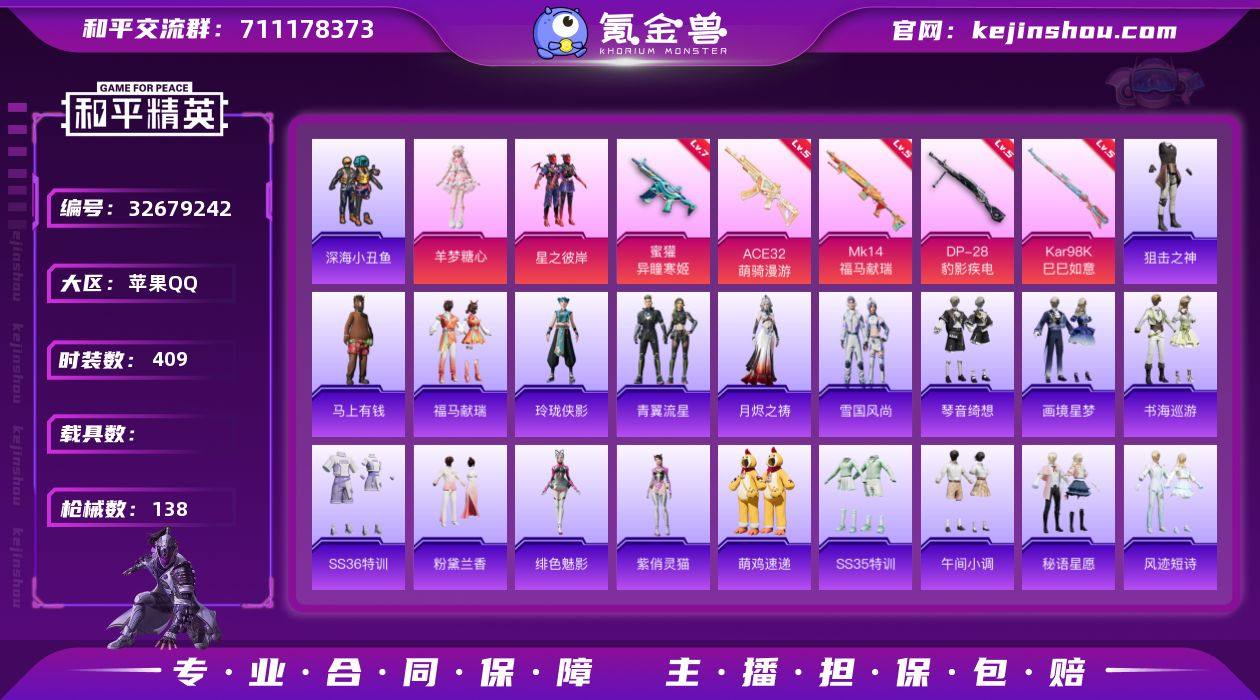实名: 可修改 时装数: 409 枪械数: 138 热门装扮: 深海小丑鱼,鹰眼刺客,星之彼岸,羊梦糖心 稀有枪皮: Kar98K-巳巳如意,DP-28-豹影疾电,蜜獾-异瞳寒姬,MK14-福马献瑞,ACE32-萌骑漫游 亮点: 【优质装备】:Mark.06(新蓝螳螂),暗影哥特(红眼罩),七级蜜獾-异瞳寒姬