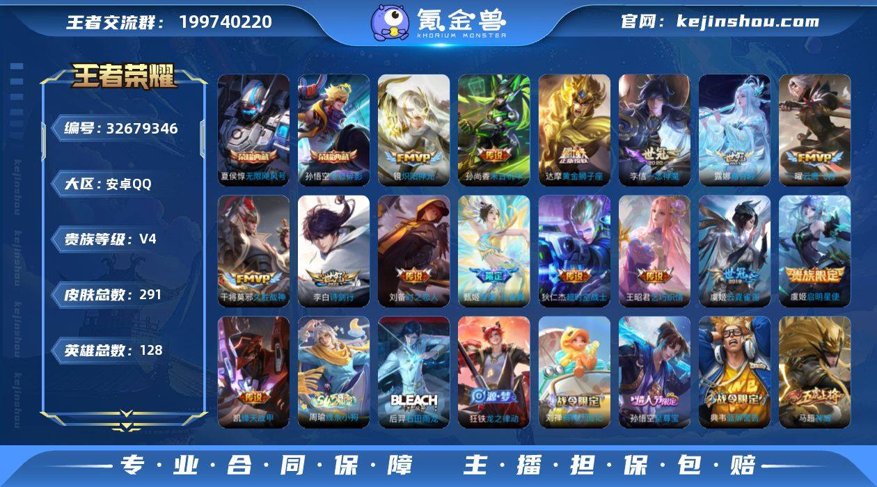 安卓Q-V4-永恒钻石I段位-128英雄-291皮肤-2典藏皮肤-15传说-84史诗 【英雄全皮】:猪八戒全皮,敖隐全皮 【荣耀典藏】:孙悟空全息碎影,夏侯惇无限飓风号 【传说皮肤】:露娜霜月吟,甄姬至美化雀舞,李白诗剑行,王昭君乞巧织情,铠绛天战甲,镜炽阳神光,虞姬启明星使,曜云鹰飞将,李信一念神魔,刘备时之恋人,干将莫邪久胜战神,虞姬云霓雀翎,达摩黄金狮子座,孙尚香末日机甲,狄仁杰超时空战士 【限定皮肤】:姜子牙天穹之誓,狄仁杰阴阳师,赵云皇家上将,赵云龙胆,嬴政优雅恋人,庄周高山流水,高渐离死亡摇滚,阿轲迷踪丽影,芈月重明,芈月幻夜卜梦,元歌云间偶戏,夏侯惇朔风刀,甄姬至美化雀舞,曹操烛龙,典韦穷奇,典韦蓝屏警告,马可波罗暗影游猎,狄仁杰魔术师,狄仁杰万华元夜,达摩沙漠行僧,项羽海滩派对,老夫子醍醐杖,关羽冰锋战神,程咬金演武夺筹,刘邦夺宝奇兵,韩信傲雪梅枪,兰陵王金庭之子,亚瑟潮玩骑士王,孙悟空至尊宝,孙悟空孙行者,牛魔御旌,后羿如梦令,后羿圣弓游侠,李元芳云中旅人,虞姬启明星使,钟馗驱傩正仪,杨玉环遇见飞天,干将莫邪真爱魔法,雅典娜单词大作战,雅典娜黎明之约,太乙真人华丽摇滚,鬼谷子原初探秘者,黄忠火...