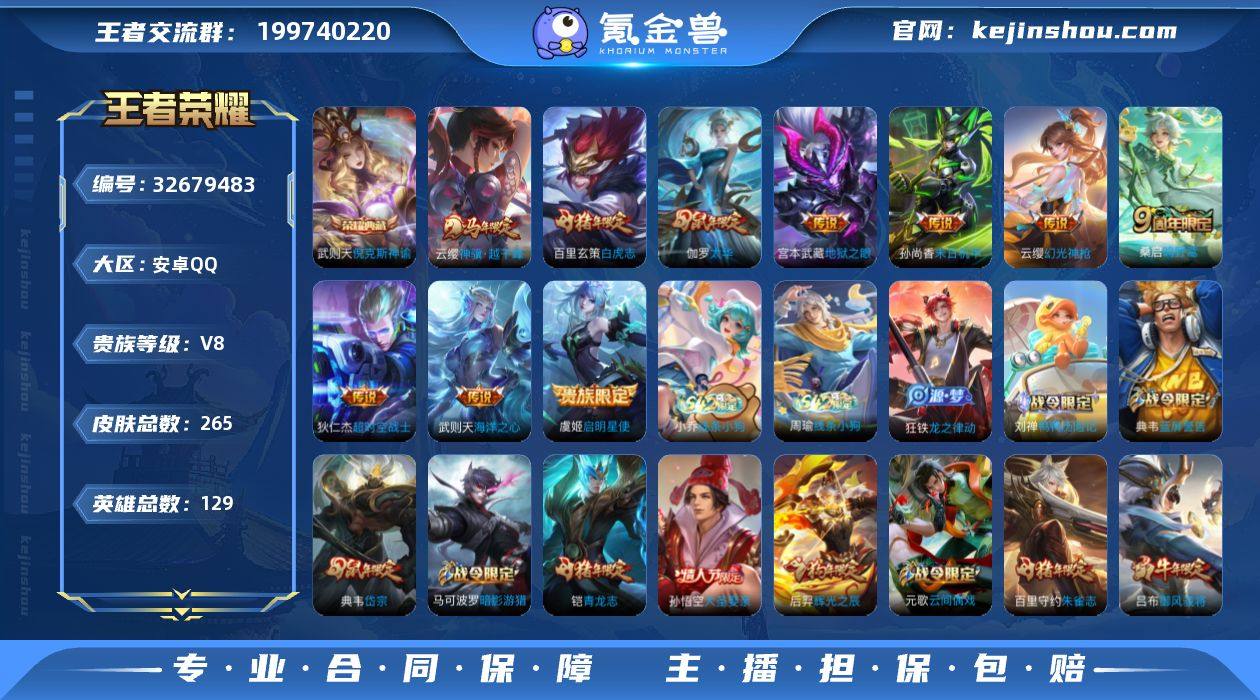 安卓Q-V8-最强王者段位-129英雄-265皮肤-1典藏皮肤-1典藏英雄-10传说-66史诗 【英雄全皮】:敖隐全皮,影全皮 【荣耀典藏】:武则天英雄,武则天倪克斯神谕 【传说皮肤】:云缨神骥越千峰,云缨幻光神枪,桑启鸣野蒿,虞姬启明星使,伽罗太华,百里玄策白虎志,孙尚香末日机甲,宫本武藏地狱之眼,武则天海洋之心,狄仁杰超时空战士 【限定皮肤】:白起狰,大乔绒语心约,狄仁杰阴阳师,虞姬凯尔特女王,赵云皇家上将,嬴政白昼王子,鲁班七号狮舞东方,庄周蜃楼王,钟无艳王者之锤,孙膑妖精王,孙膑天狼运算者,扁鹊炼金王,芈月重明,吕布猎兽之王,吕布御风骁将,周瑜赤莲之焰,元歌云间偶戏,夏侯惇朔风刀,甄姬游园惊梦,曹操烛龙,典韦穷奇,典韦蓝屏警告,典韦岱宗,马可波罗暗影游猎,狄仁杰魔术师,狄仁杰万华元夜,达摩沙漠行僧,项羽海滩派对,老夫子醍醐杖,程咬金演武夺筹,韩信飞衡,兰陵王驯魔猎人,花木兰瑞麟志,亚瑟潮玩骑士王,孙悟空大圣娶亲,牛魔御旌,后羿辉光之辰,李元芳银河之约,虞姬霸王别姬,虞姬启明星使,钟馗神迹守卫,杨玉环遇见飞天,女娲朔望之晖,蔡文姬繁星吟游,太乙真人饕餮,东皇太一逐梦之光,鬼谷子原初探秘者,铠青龙志,苏烈玄...