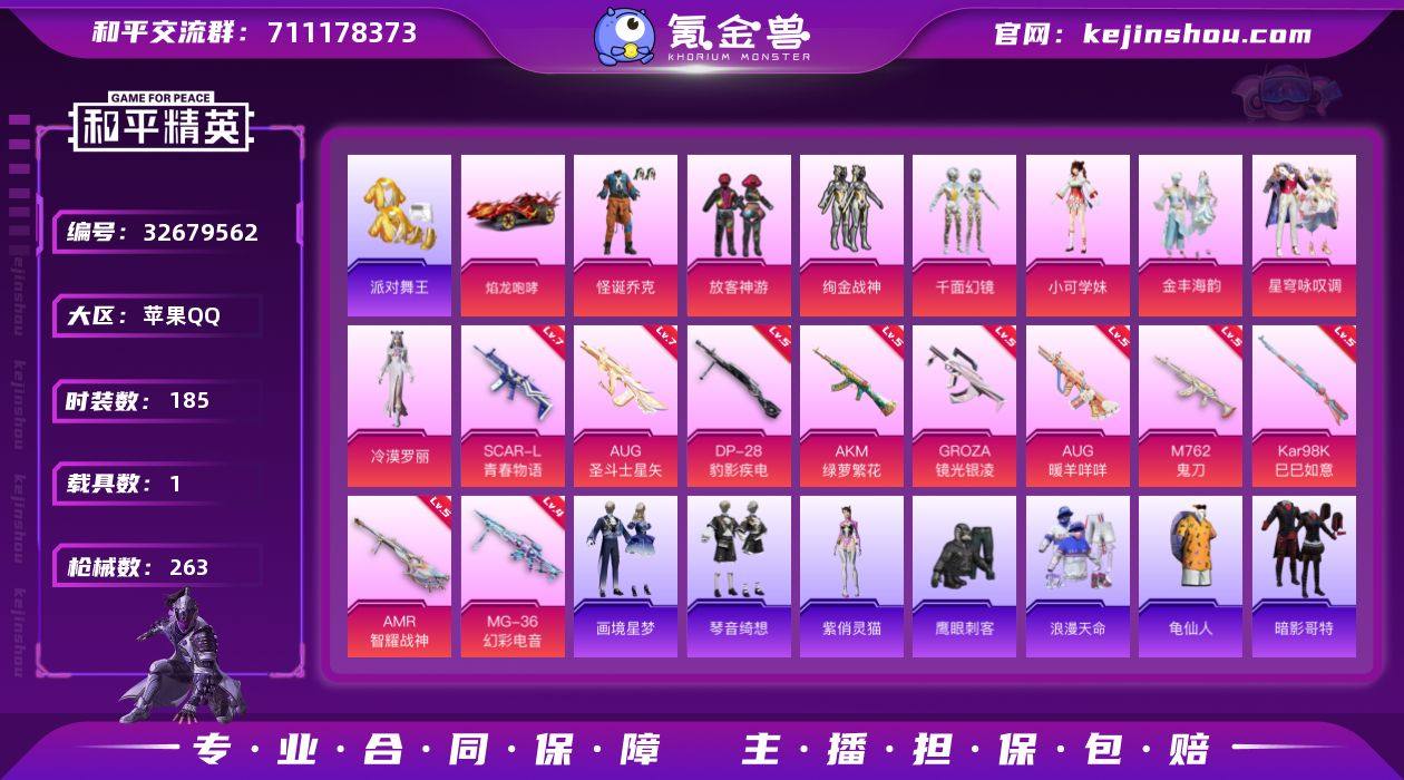 苹果 手Q-无敌战神框-8粉装-12特效枪-1载具-5粉色飞行器-76811热力值-24王牌印记-185套装-263枪皮 【热门品类】:粉装-怪诞乔克,绝对防御上衣,套装-浪漫天命,套装-派对舞王,套装-SS1特训,旭日初心兜帽大衣,套装-龟仙人,套装-暗影哥特,套装-粉红小猪,熔岩游骑兵连帽夹克 【粉色套装】:粉装-怪诞乔克,粉装-放客神游,粉装-绚金战神,粉装-千面幻镜,角色-小可学妹,粉装-金丰海韵,粉装-星穹咏叹调,角色-冷漠罗丽 【粉色枪皮等级】:AKM-绿萝繁花(五级),SCAR-L-青春物语(七级),GROZA-镜光银凌(五级),AUG-暖羊咩咩(五级),AUG-圣斗士星矢(七级),M762-鬼刀(五级),UMP45-萌骑冒险(五级),Kar98K-巳巳如意(五级),Mk14-福马献瑞(五级),AMR-智耀战神(五级),DP-28-豹影疾电(五级),MG-36-幻彩电音(四级) 【粉色载具】:焰龙咆哮 【粉色枪皮】:AKM-绿萝繁花,SCAR-L-青春物语,GROZA-镜光银凌,AUG-暖羊咩咩,AUG-圣斗士星矢,M762-鬼刀,UMP45-萌骑冒险,Kar98K-巳巳如意,Mk14-福马献瑞,AMR-智耀战神,DP-28-豹影疾电,MG-36-幻彩电音 【粉色飞行器】:祥瑞起舞飞行器,齐天大圣飞行器,镜光幻境飞行翼,凤舞九天飞行器,暮色之舞飞行器 【粉色降落伞】:PEL轰...