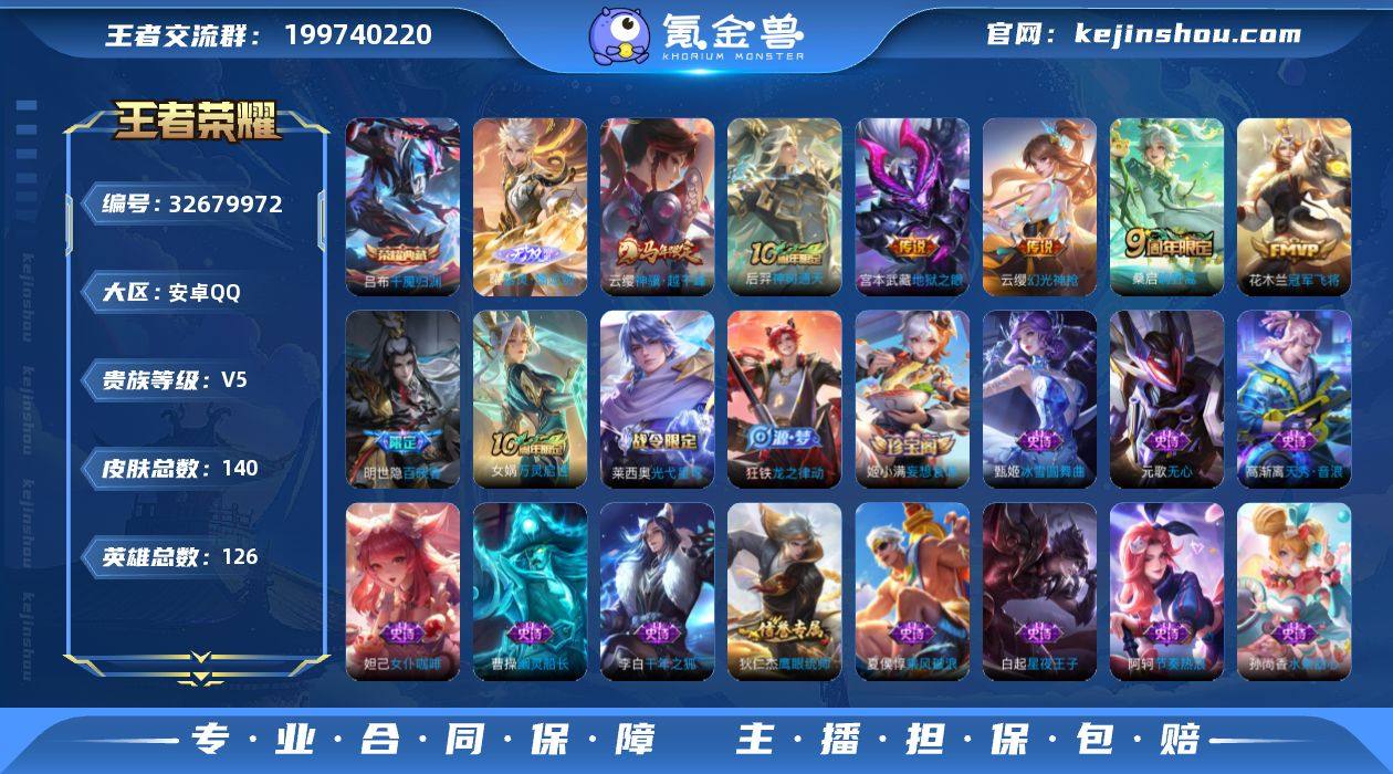【王者荣耀】珍品无双0 典藏1 无双1 珍品传说0 传说6 史诗28 英雄126 皮肤140 贵族5级 荣耀典藏:千魇归渊__无双皮肤:器灵·螭龙剑__传说皮肤:鸣野蒿|地狱之眼|冠军飞将|幻光神枪|神树通天|神骥·越千峰__稀有限定:海滩派对|皇家上将|剑破天穹|天穹祈灯|妄想食味|无心|阴阳师|暗夜贵公子|冰雪圆舞曲|乘风破浪|德古拉伯爵|地狱岩魂|功夫厨神|鬼剑武藏|节奏热浪|女仆咖啡|圣诞狂欢|水果甜心|天秀·音浪|赵云-未来纪元|星夜王子|摇滚巨星|鹰眼统帅|幽灵船长|逐浪之夏|噬灭天穹|敬我三分|虞姬-夏日便利店|天穹之誓|千年之狐|谧流熔炉|达摩-星际陆战队|龙之律动|布丁狗之约|虚灵犬护|逆浪荇歌|黄忠-百相守梦|光弋星穹|往忆晖光|荣光之誓|万灵启世|鹤鸣心笺|小乔-线条小狗|周瑜-线条小狗|百晓客__优质皮肤:创世神祝|埃及法老|孤猎|木偶奇遇记|激情绿茵|海之征途|天启骑士|冰刃幻境|海军大将|启蛰|芝加哥教父|绝影神枪|地府判官|幸存者|赤焰之缨|前尘|龙域领主|花见巫女|灼热之刃|精准探案法|暗都幽影|功夫炙烤|潮玩探月行|秘密基地|次元突破|鲨炮海盗猫|野性能量|功夫老勺|命运角斗场|幻想奇妙夜|兔女郎|死亡骑士|黄金武士|少女阿狸|天使之翼|宫本武藏-未来纪元|街头霸王|教廷特使|时空...